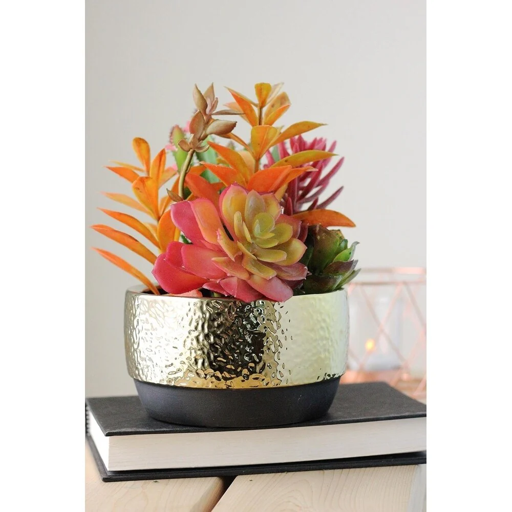Extremely realistic mix of succulent plants are nestled in a gold hammered finish ceramic pot