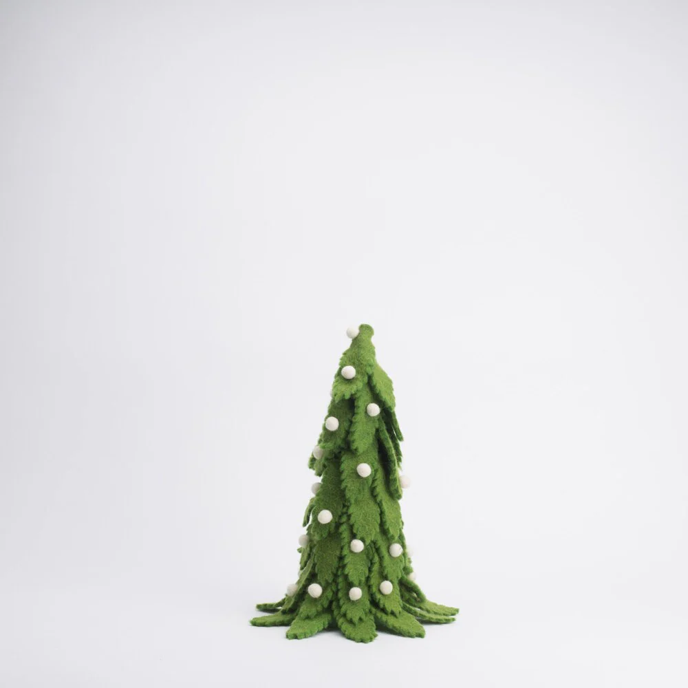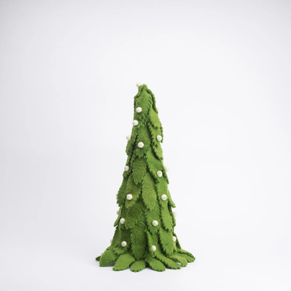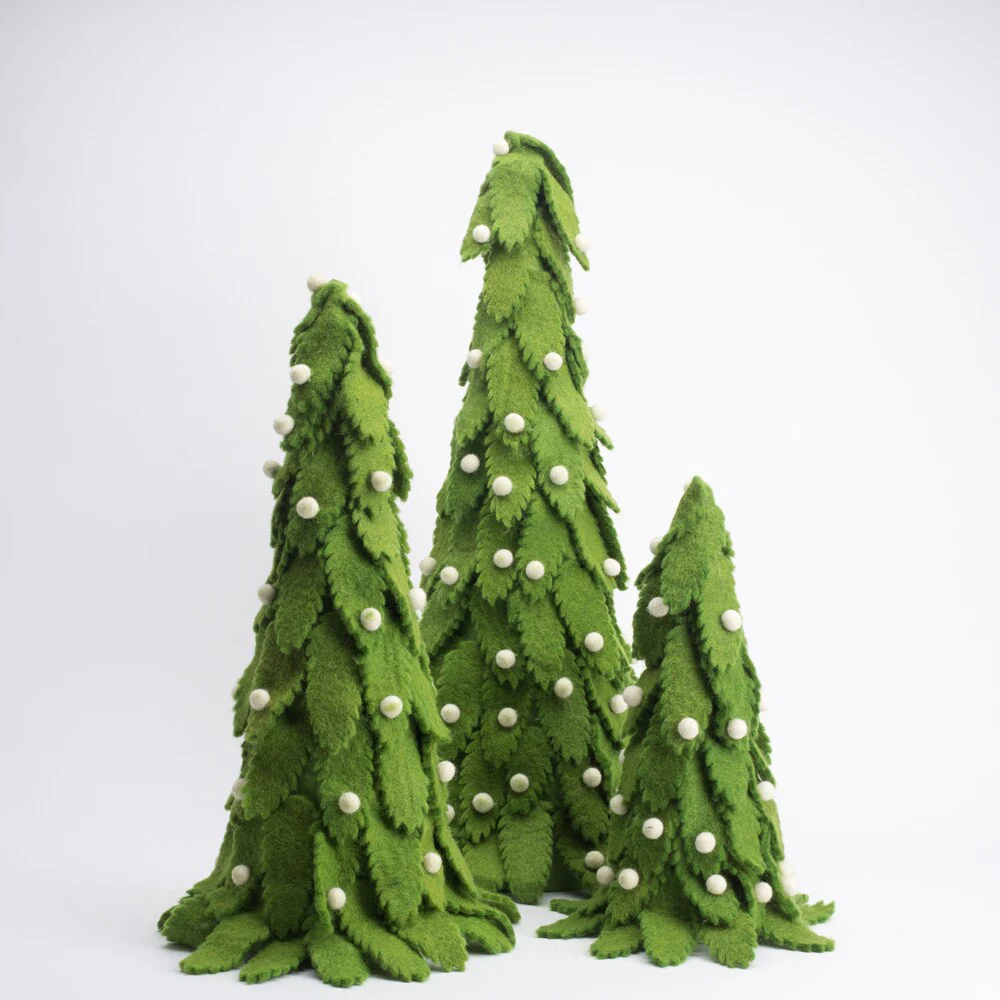 A felted green forest creates a whimsical display for Winter. Crafted from evergreen colored wool felt, layers of pinking trimmed felt leaves" adorned with tiny white pompom details create a trio of heirloom quality trees perfect for display on tabletop. Trees range in size from 14" to 25 and come as set of three.