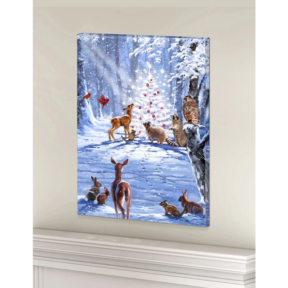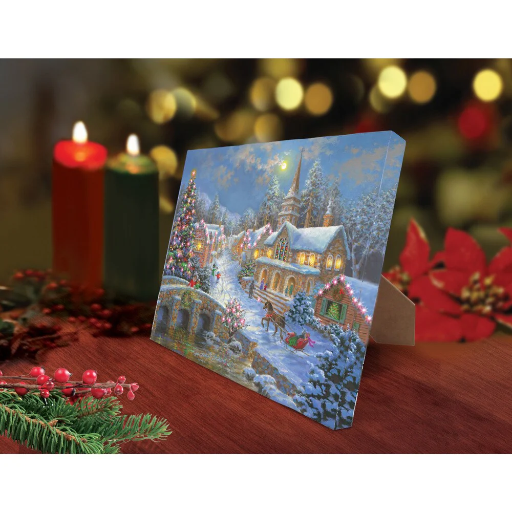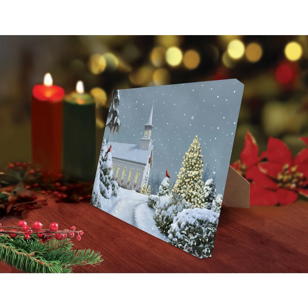 Elevate the beauty of your holiday decor with this battery-operated illuminated artwork. This charming art piece includes an easel for display and a timer for convenient operation.