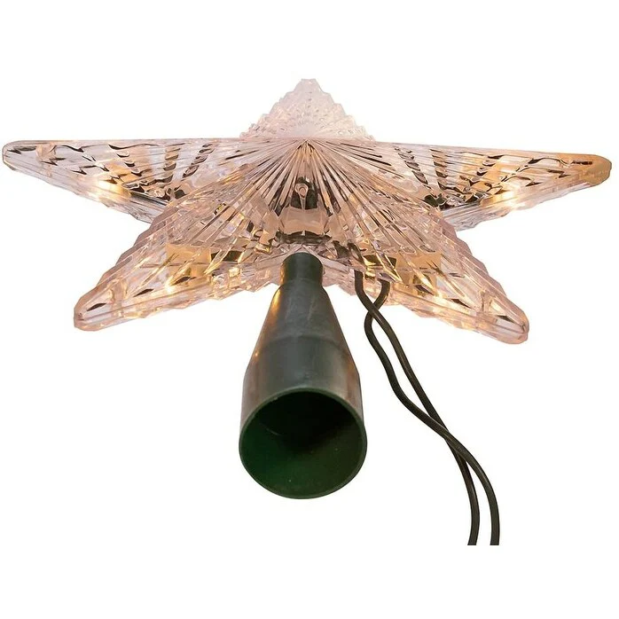 This 10-light 7" clear star treetop by Kurt Adler is a beautiful and festive way to add to and accent the d茅cor of your Christmas tree. Its classic 5-point star design has an iridescent silver finish and is pre-lit with a total of 10 lights. Each star has a 30" white lead wire, 12V 0.72W clear incandescent bulbs, 4 spare bulbs, and 1 fuse. For indoor use only.