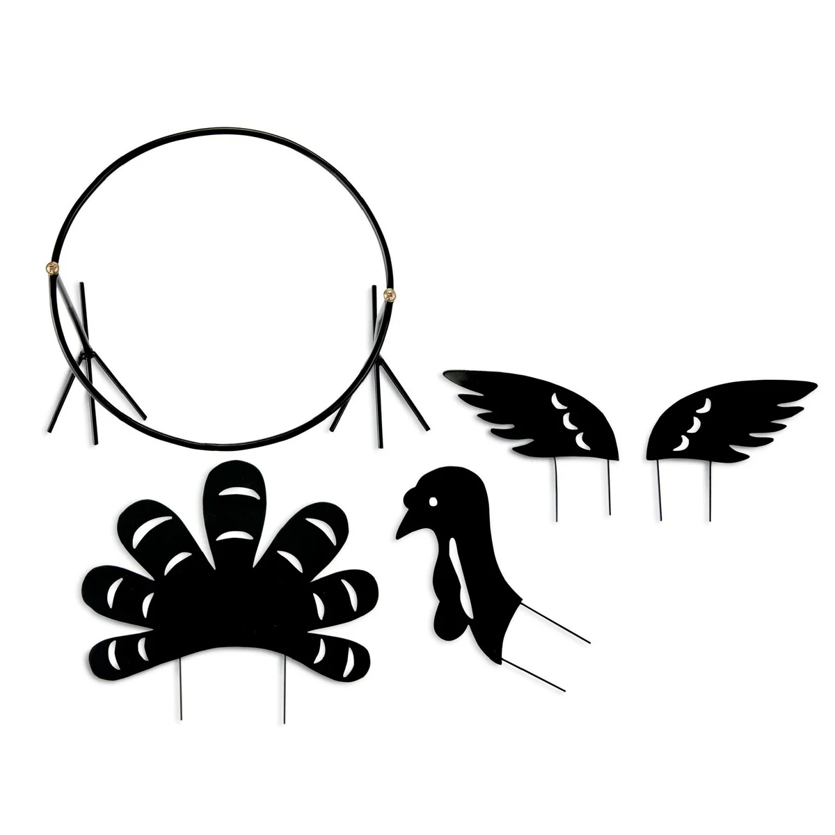 Don't toss your pumpkin after Halloween! Turn it into a festive turkey with this easy kit. Craft your pumpkin turkey in seconds by placing your pumpkin inside the leg base, and adding the poke in features including the feathers, wings and head. Iron. Base Measures 9"Dia. x 7"H.