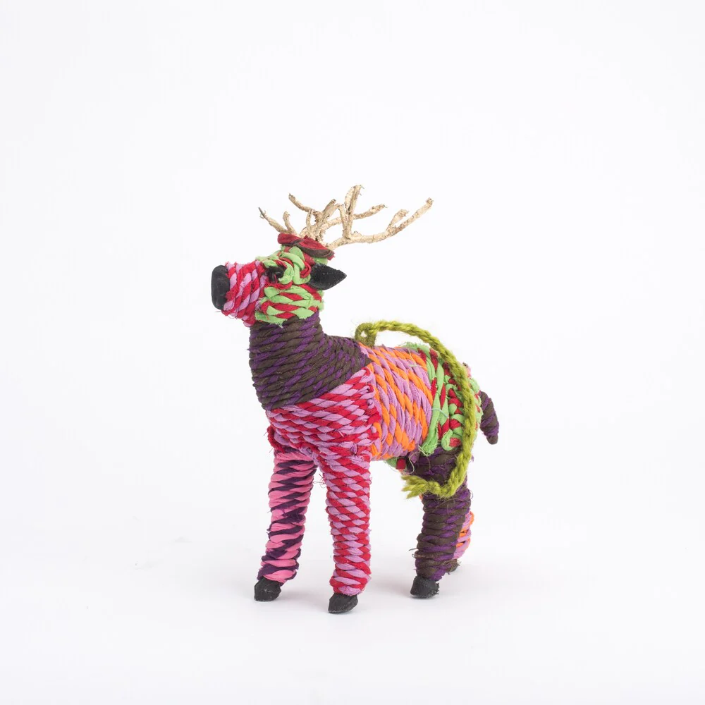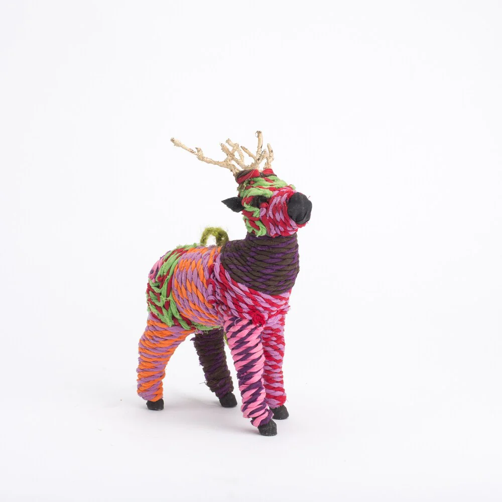 This colorful reindeer ornament has been created by hand using the style of hand woven rugs. Artisan made, twisted strips of recycled fabric are expertly placed on a sturdy form. With realistic face details, each ornament will vary wtih its own unique character. Ornament measures approximately 6' x 7'.