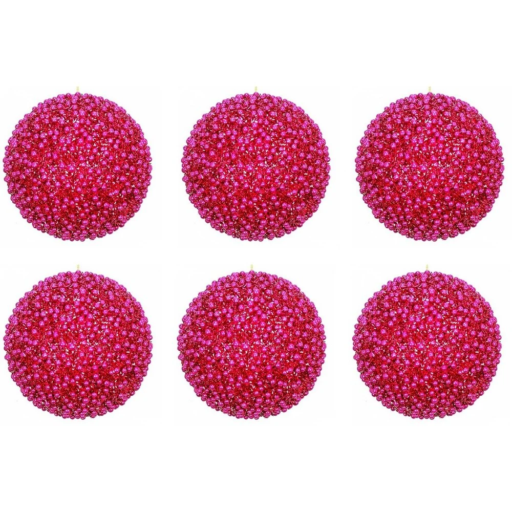 Pink Plastic 4-inch Glitter Pearls Christmas Ornament Ball (Set of 6)