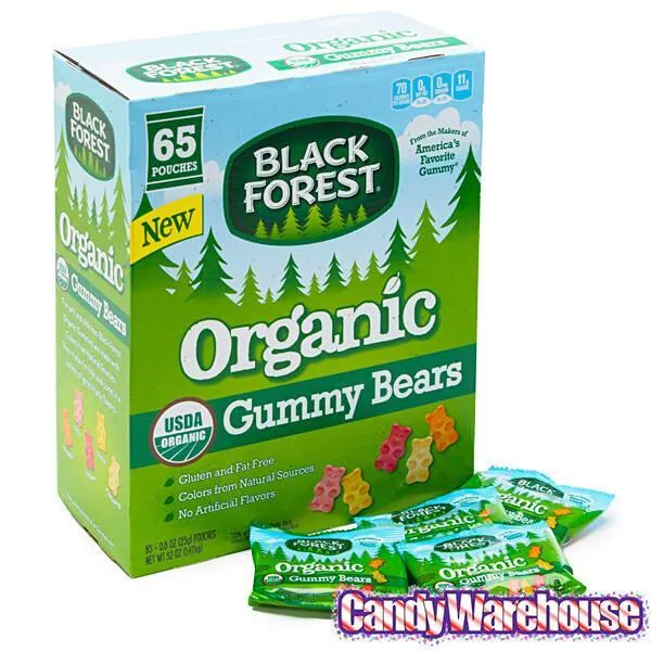 Box contains 65 snack packs of Black Forest Organic Gummy Bears Candy.