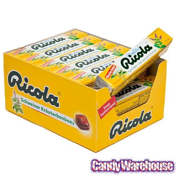 Display box contains 18 packs of Ricola Herb Candy Drops.
