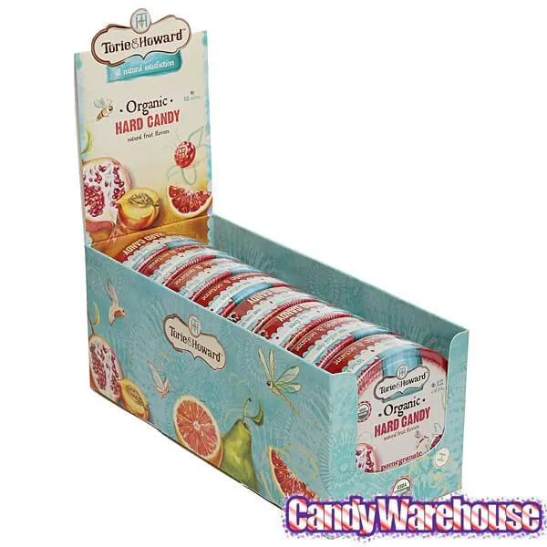 Display box contains 8 Pomegranate & Nectarine Torie and Howard Hard Candy Tins, each with a net weight of 2 ounces.