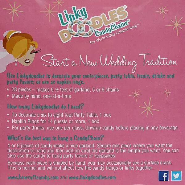 Elegant and delicious, these white and pearl white striped links are absolutely perfect for decorating any formal affair. They make fancy napkin holders as well as great embellishments for drinks! Or go ahead and get crafty -- link a few together to create chains and encircle table settings. An entire box of LinkyDoodles is enough to craft a 5.5 foot long garland made of real candy! Best of all, clean-up’s a breeze with these vanilla mint flavored hard candy canes… your guests won’t be able to keep their hands off them! Link with ‘em, clink with ‘em, drink with ‘em -- one-of-a-kind and shaped by hand, LinkyDoodles are sure to impress at your next event!