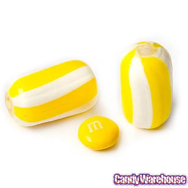 Bag contains 5 pounds of Yellow Sassy Cylinders Striped Candy.