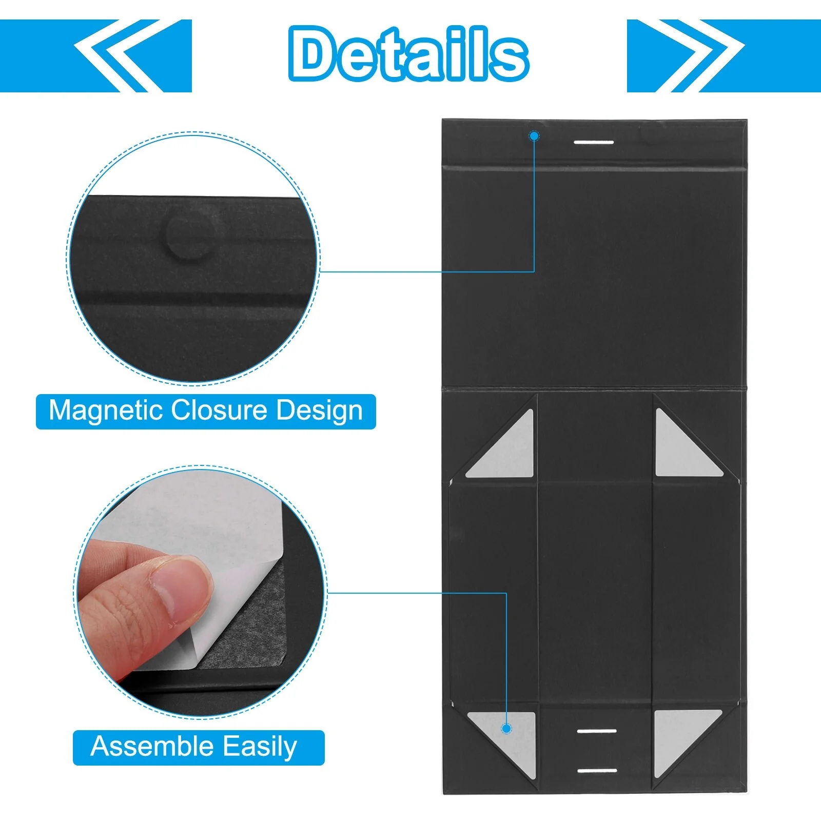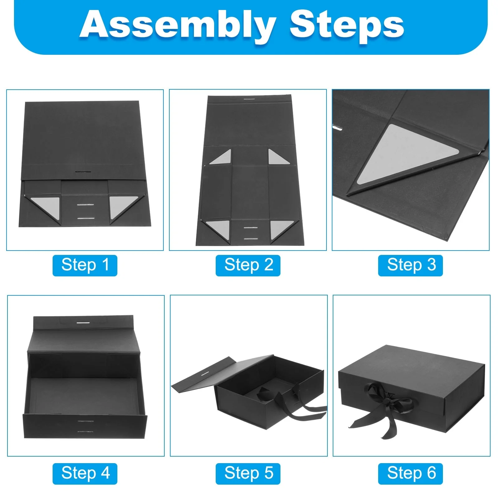 The gift box you receive is in a flat state. Peel off the self-adhesive film on the four corners of the box fold it and stick it on to get a beautiful gift box.