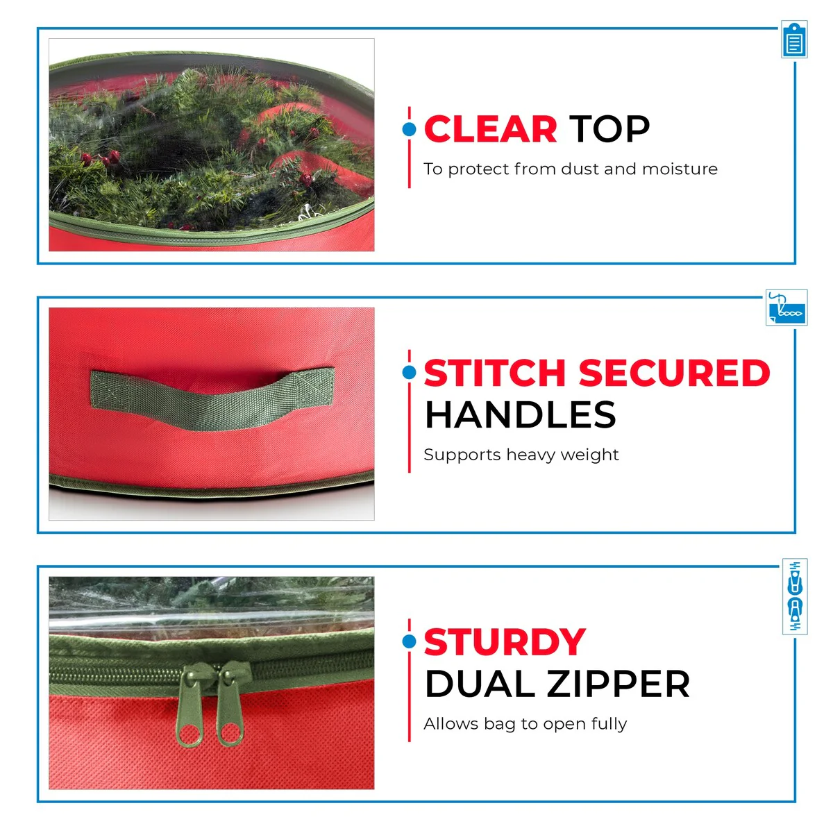 • DURABLE HANDLES-Transporting the wreaths is simple and fast with 2 stitch-reinforced carry handles. Safely swing them it in and out of storage and easily hang the bags on hooks.
