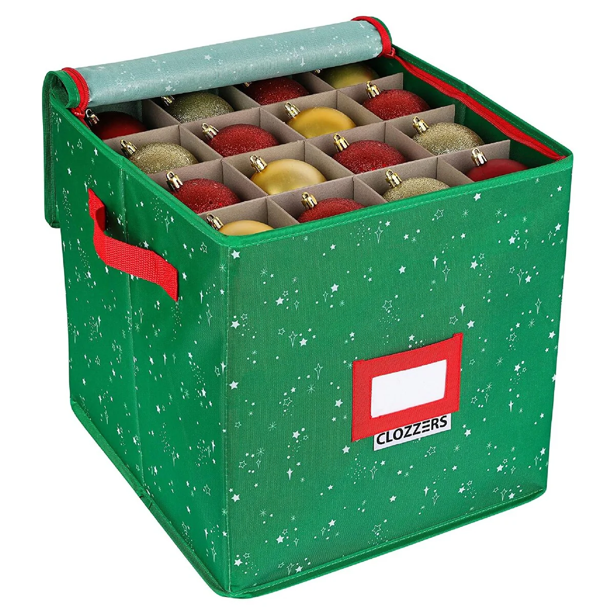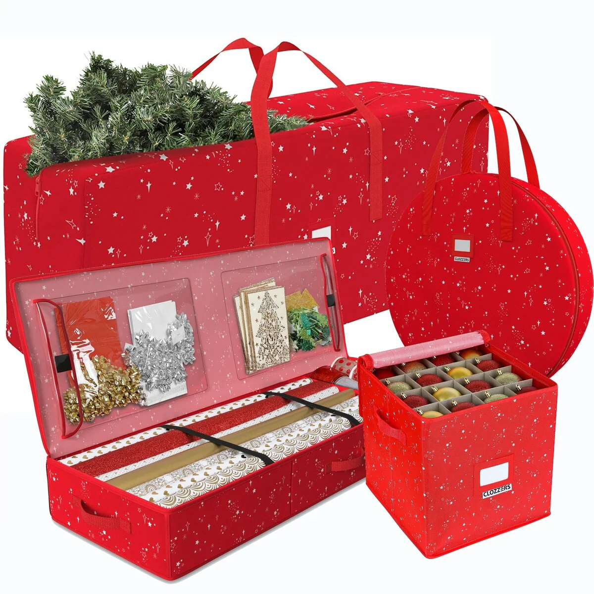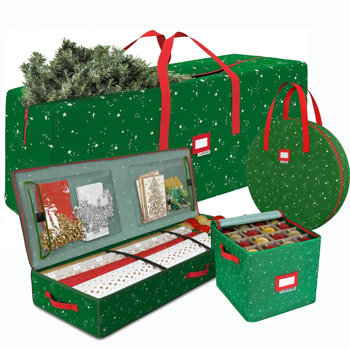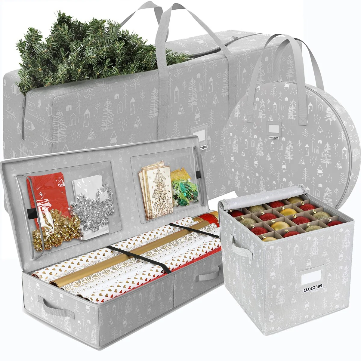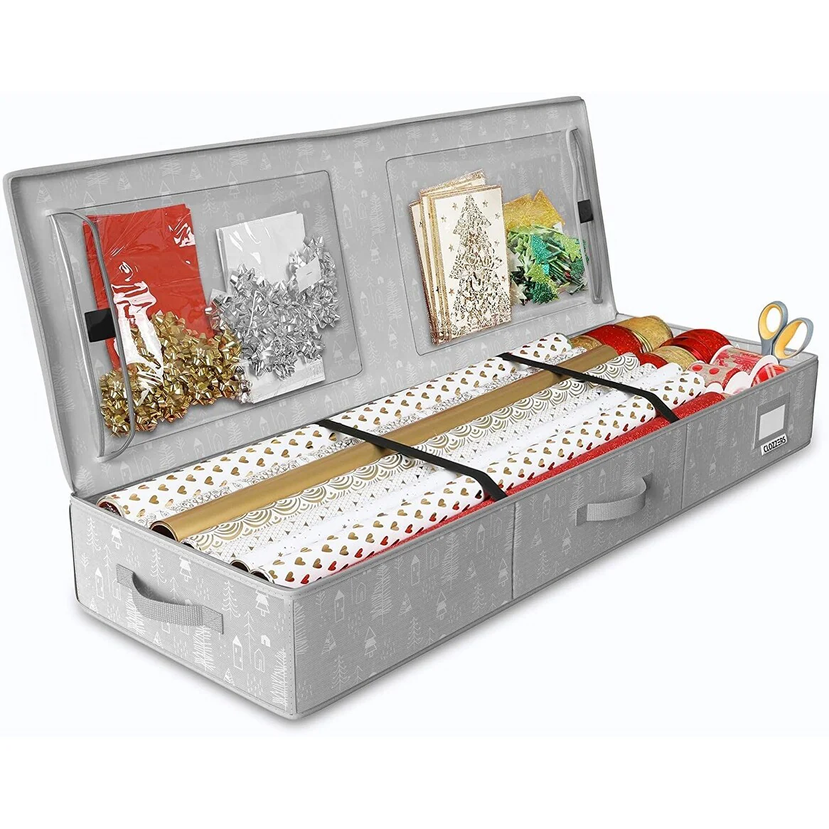• After the holidays, simply place any wreath or rolls of garland, into this strong bag then zip it up and store in a closet or the attic until the next holiday• Large tree storage case: Easily place the pieces of your artificial Christmas tree into this strong bag with a roomy interior, zip and tuck into a closet or store in the attic for safekeeping• Adjustable Dividers: This is the perfect Christmas ornament storage solution with adjustable dividers that can be arranged to handle ornaments of various sizes.• Features: Spacious Storage for Gift Wrap Paper & Supplies: Hold up to 18-24 rolls of wrapping paper in this spacious storage box with room for your ribbons, scissors, tape and other accessories in the two large pockets.• Get a Good Grip with the Strong Handles: Easily carry to the storage shed, up a ladder or upstairs with the sturdy reinforced handles!