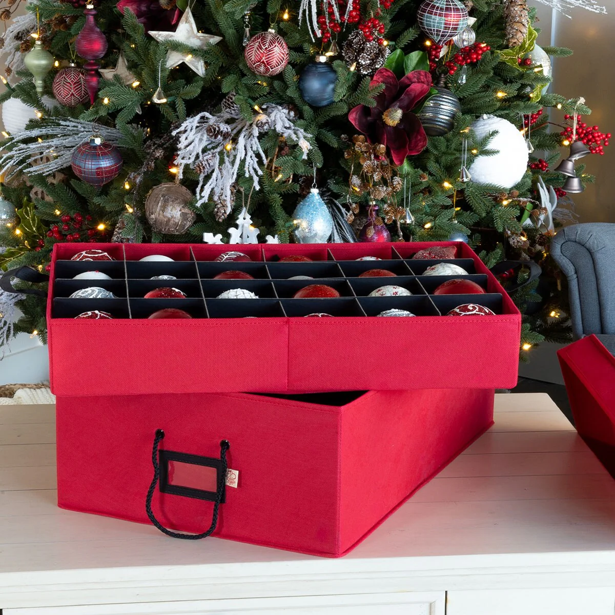 You're used to that large box of Christmas ornaments that have been wrapped in newspaper and crammed together in the messiest game of Tetris ever, however, you know this doesn't work. Ornaments will inevitably be crushed or will be discolored by the acid found in the very paper you used to try and protect the ornaments with. We completely relate to the frustration attempting to box all your ornaments in one place while protecting their fragility. The Two Tray 4 in. Christmas Ornament Storage Box will hold your ornaments safe and organized all year long. The lightweight Christmas ornament box holds 48 (4 in.) ornaments, 24 in each tray, with dividers between the ornaments. The Christmas ornament organizer trays and dividers are acid-free to protect the vibrant colors of your ornaments from damage and discoloration. While decorating the tree, the trays can be removed and individually carried allowing you to place the xmas ornaments onto the tree right out of the tray. To keep track of your Christmas tree ornaments the front of the box has a clear ID window for tags listing the contents of the box. The ornament storage box features a festive red exterior fabric with braided rope carrying handles. The Two Tray Christmas bulb storage bin will keep your 4 in. ornaments safe and shining year after year.