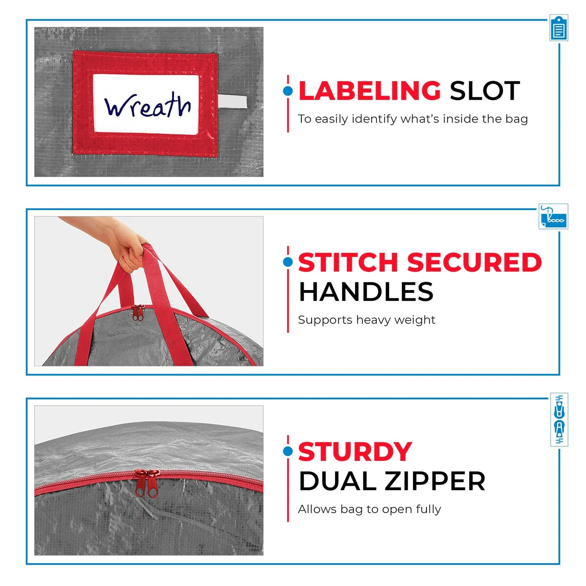 • HANDY FEATURES-3 rivet-enforced side handles for easy carrying; 2-way dual zipper to safeguard your ornamentations and a card slot for immediate identification.