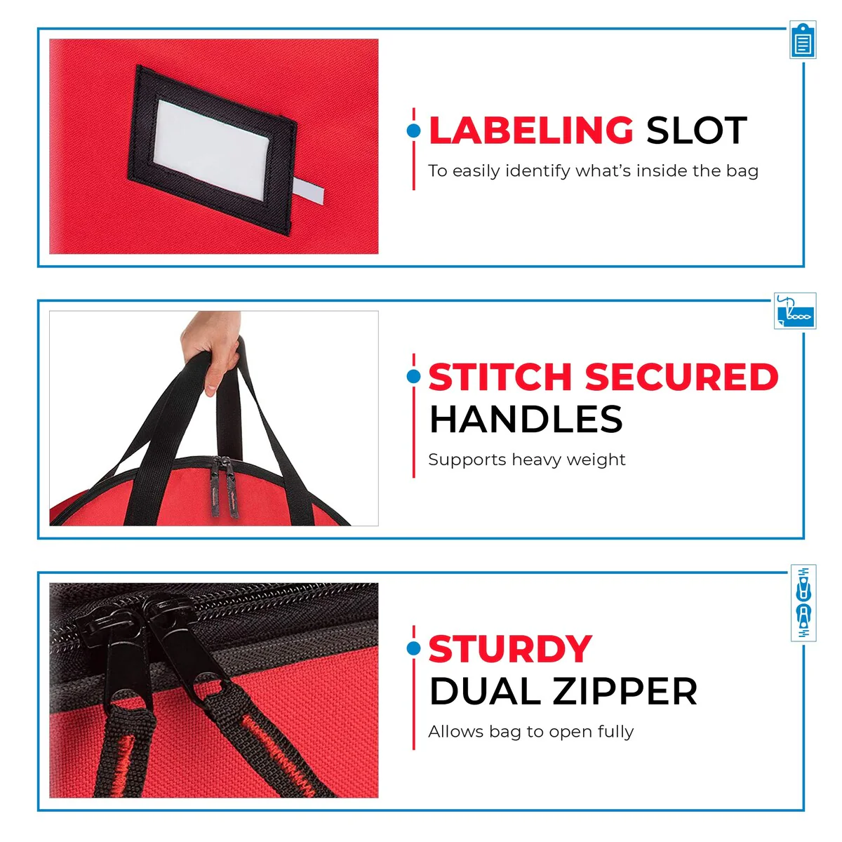 • HANDY FEATURES-Positioned on the inside, you will find two wreath-securing Velcro straps, preventing the wreath from moving about and losing its form and shape. Located on the forefront of the bag is a name tag for immediate recognition of the interior, saving you the trouble of opening and closing each one separately.