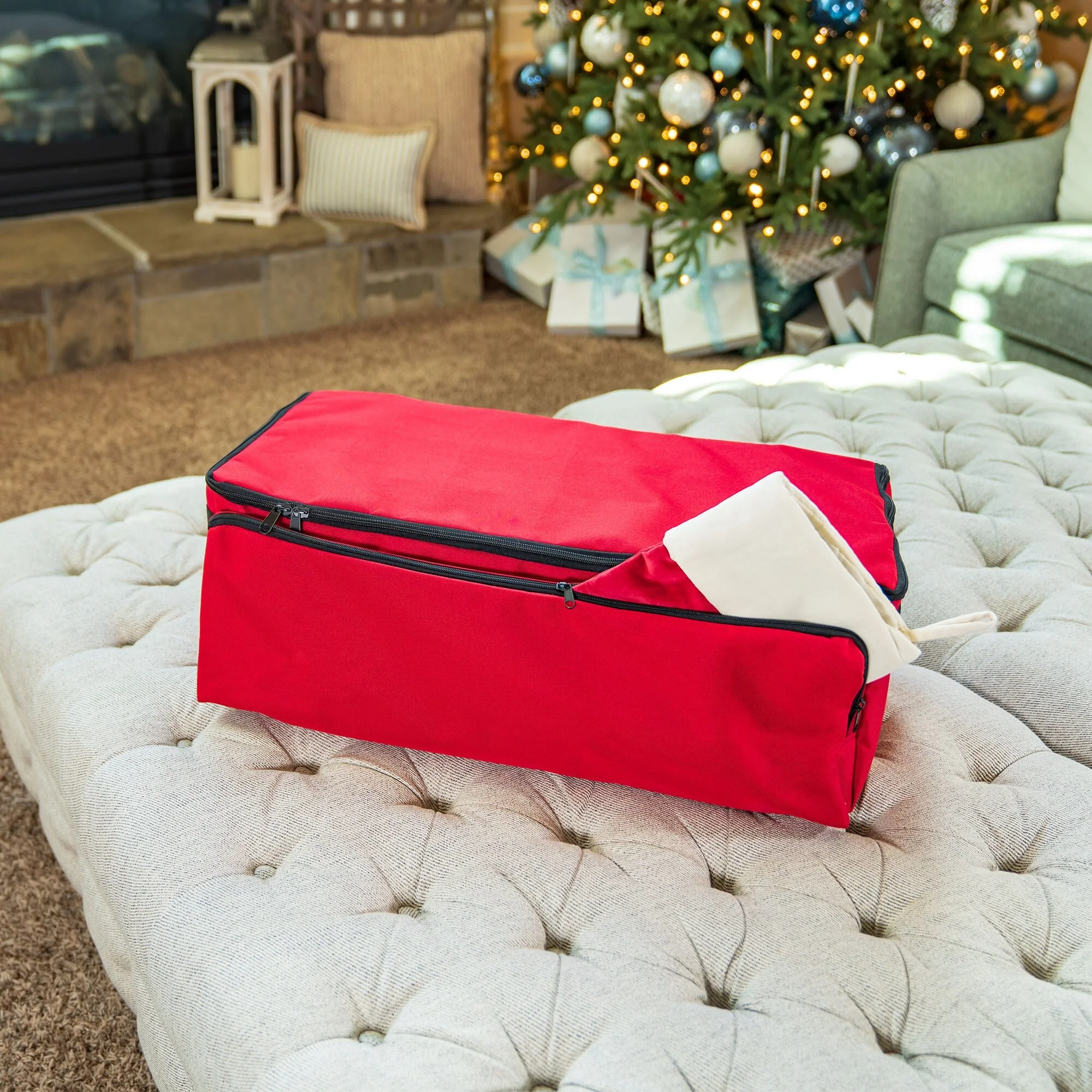 You're used to that large box of Christmas tree ornaments wrapped in newspaper and crammed together in the messiest game of Tetris ever, however, you know this doesn't work. Ornaments will inevitably be crushed or discolored by the acid found in all papers. We completely relate to the frustration attempting to store all your ornaments in one place while protecting their fragility. This three-tray Christmas ornament storage box with deep side pockets will keep all your ornaments safe in a neat orderly fashion. The Christmas ornament organizer trays hold 72 (3 in.) ornaments from your bright crimson glazed bulbs to your grandkid's homemade popsicle stick picture frame. For larger decorations, light's, or candles there are six (9 in.) deep side pockets and one large pocket on the front. Carrying all of those decorations will be safe and easy with the bag's reinforced handles. The fabric on the trays are acid-free, which is important for preventing ornament discoloration. Once your decorations are up you can remove the trays allowing the bag to collapse and fit easily into a nearby drawer or storage place. This Christmas keep all your tree decorations in one place safe, keep them clean, and keep them easily accessible for next year. In the end, you're saving yourself the time while keeping your most precious and sentimental xmas ornaments safe.