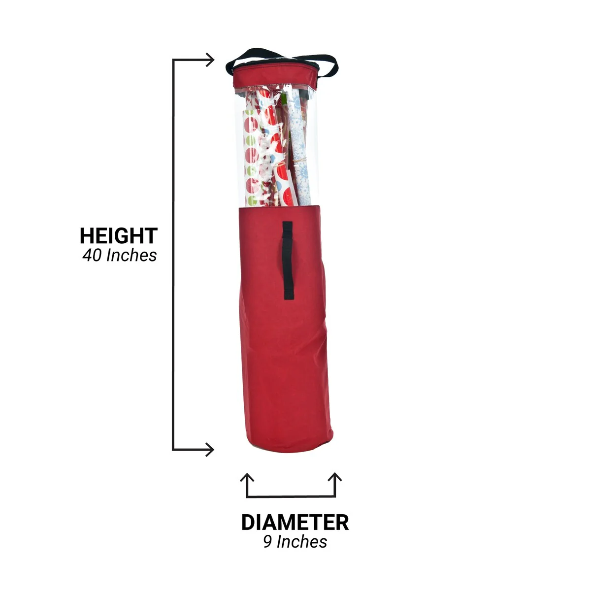 Storage for wrapping paper rolls from Christmas, Birthdays, and other occasions can be difficult. Simply placing your rolls in storage can lead to them getting lost, forgotten, smashed or otherwise damaged. The 40 inch Wrapping Paper Storage Container helps with all of these issues. The bag can fit twelve or more 40 in. rolls of gift wrap which can be viewed through the large plastic windows on top and around the bag eliminating the guessing game of what's inside the bag. No matter how many rolls you manage to fit in the bag the reinforced handles can easily manage the weight. This gift wrap storage bag is a low-cost solution to throwing your wrapping paper out every year, and can be especially helpful if you buy your wrapping paper on clearance after Christmas is over and need a place to store it for the rest of the year. Keep your wrapping paper for all occasions visible and safe in this Wrapping Paper Storage Bag.