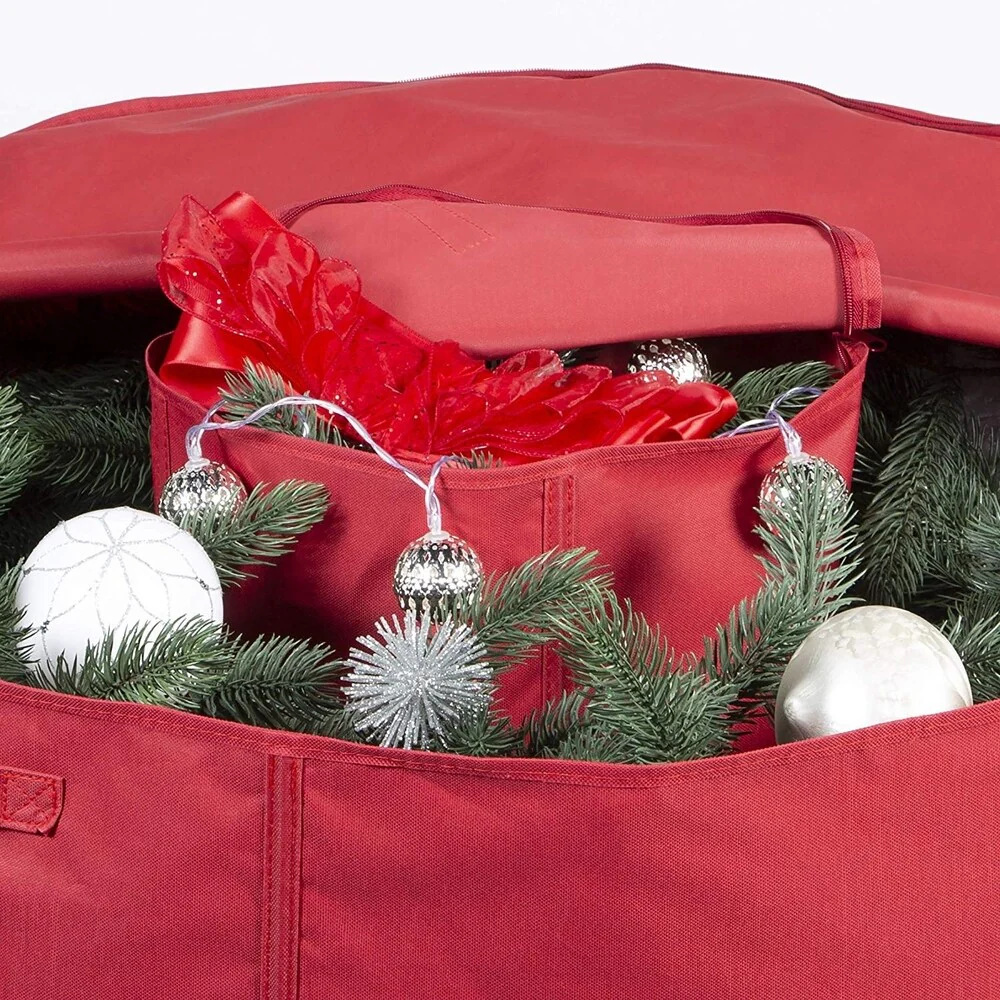 - DURABLE! LIGHTWEIGHT REINFORCED FABRIC THAT PROTECTS YOUR CHRISTMAS DECORATIONS: The problem with other Christmas Wreath Storage Organizers is that the handles pull out or the zippers easily get stuck. Our wreath container solves that problem! Why? That's because our Christmas wreath storage bag is made with a sturdy easy to open zipper that offers a strong closure. Along with reinforced handles allowing for easy mobility, especially when needing to bring into attic or basement storage.