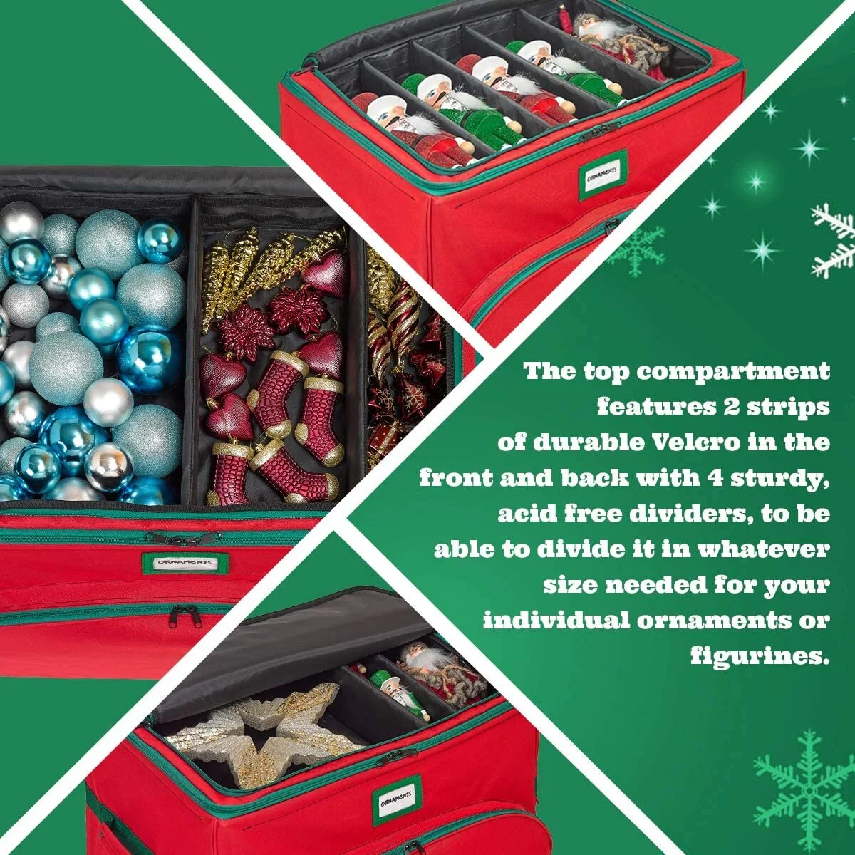 - HOLIDAY SOLUTIONS YOU'LL LOVE: Our Christmas Ornament Storage Box with Dividers aims to solve your problems and make life easier for you so that you can spend less time stressed & more time relaxing and enjoying the holidays with your family, friends and loved ones. That's why customer satisfaction is the cornerstone of our business so you can be confident that your satisfaction is always our top priority.