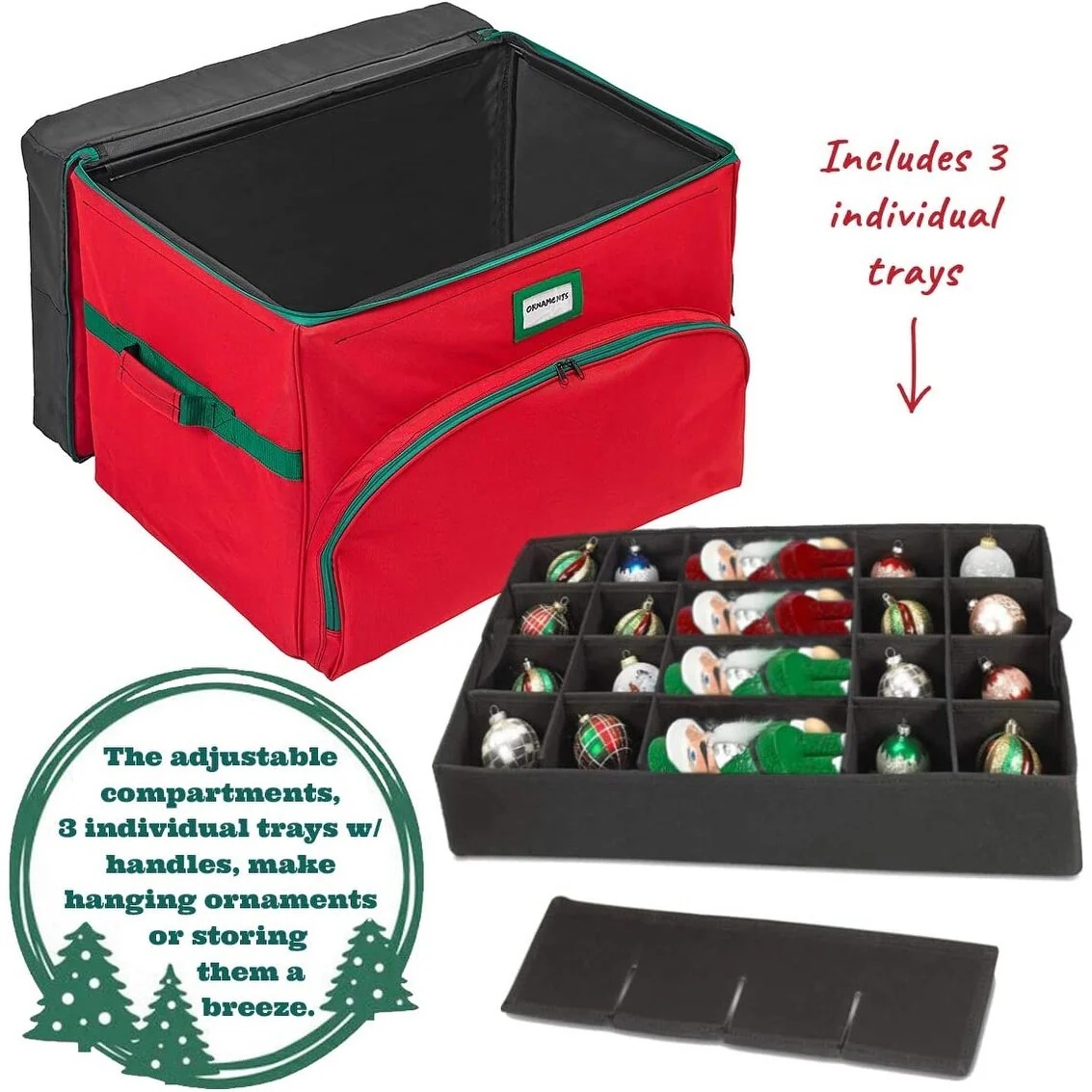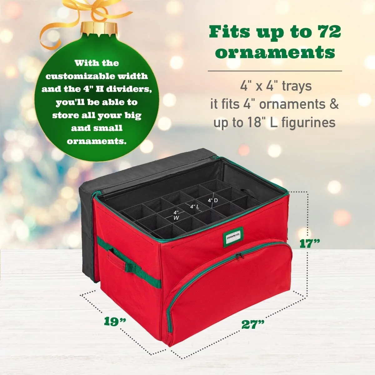 - 3-TIERS. EASY TO CARRY TRAYS: The Christmas Ornament Storage Box safely holds up to 72 ornaments 4” x 4” in 3 tiers with removable and stackable trays. The spacious front pocket can store your tree skirt, stockings or tinsel. Additional top pocket with 4 adjustable dividers is perfect for storing your Christmas Tree Lights or additional ornaments up to 18 inches in length. Easy-carry handles on each tray are reinforced, padded and help to make decorating easier each holiday season.