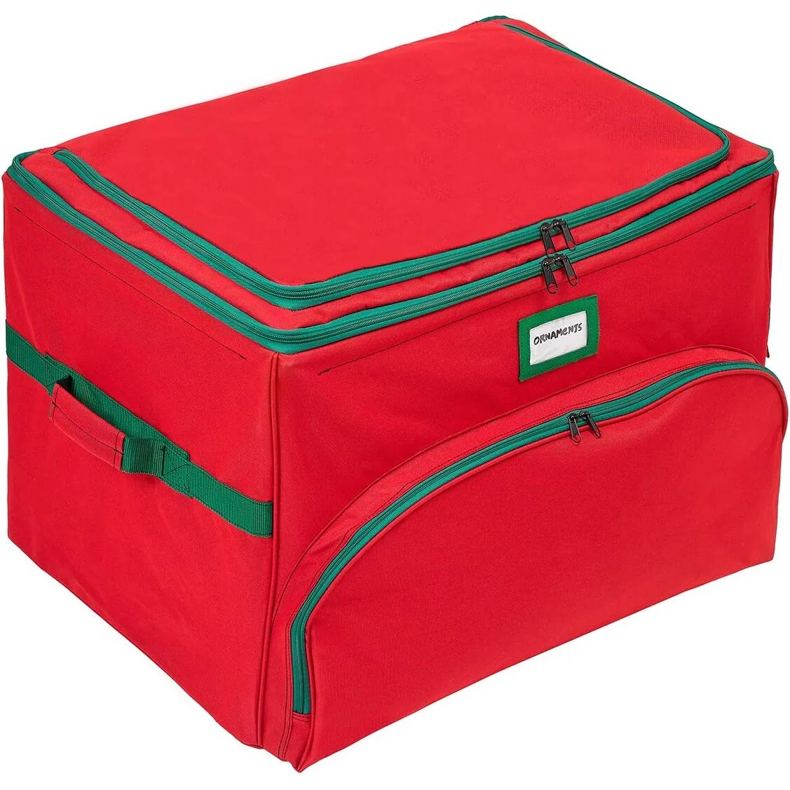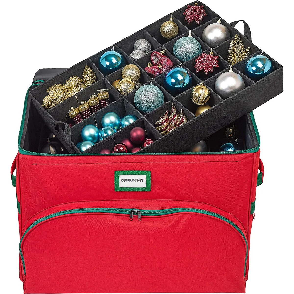- PROTECTS YOUR VALUABLE ORNAMENTS: This Ornament Storage Box safely organizes all of your holiday treasures. The organizer holds up to 72 - 4-inch by 4 inch ornaments in 3 stackable tiers. Each tray has durable handles allowing you to comfortably carry your ornaments to and from your tree. The additional padded top pocket with zippered closure is great for oversized ornaments, larger and odd-shaped ornaments thus significantly reducing the need for extra containers