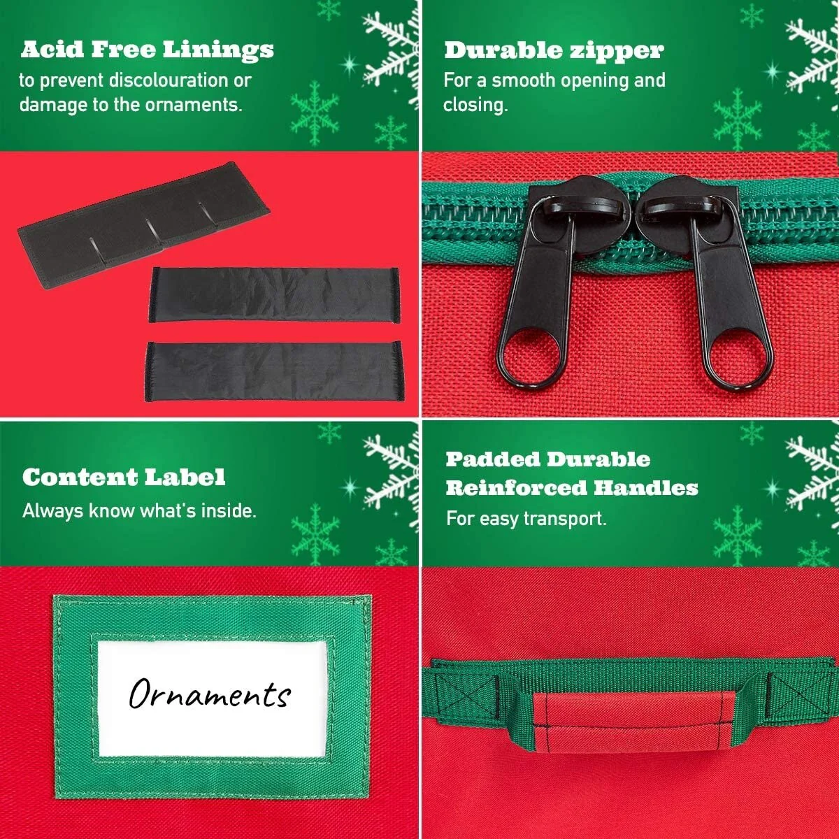 - STORES AND ORGANIZES: We want you to enjoy and preserve your collection of beautiful holiday treasures for a lifetime. The removable trays are covered with acid-free fabric preserving your ornaments' color and finish so they will always look like their brand new. The sturdy zipper closure cover will keep your decorations dust and dirt free. The stackable storage trays are designed so that they won't crush your ornaments.