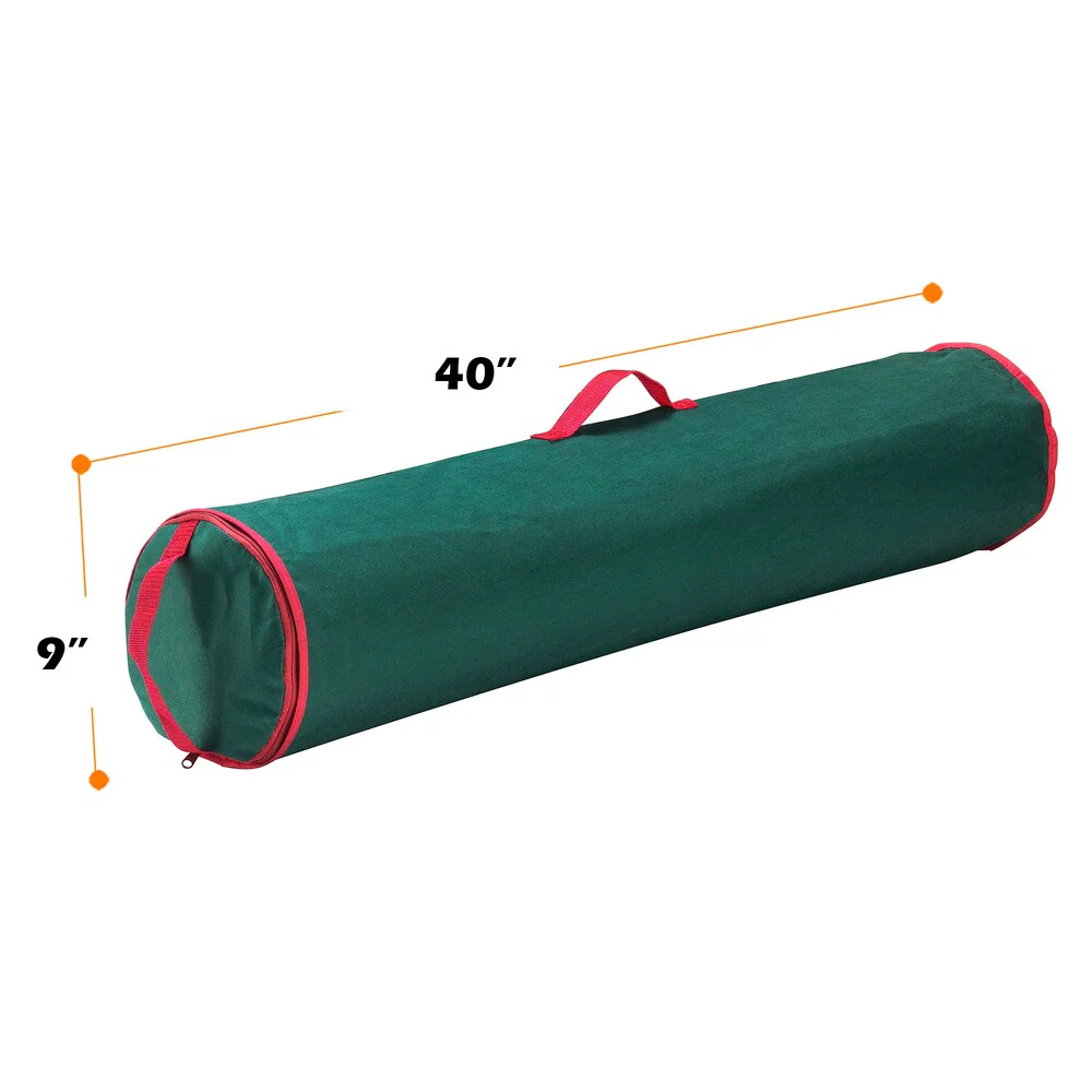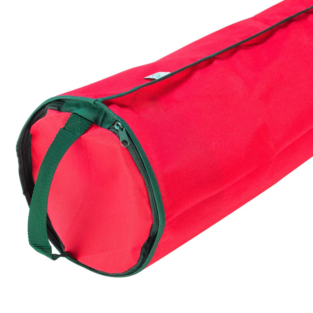 The Elf Store makes it easy to store your left over and unused gift wrapping paper rolls. The gift wrap storage bag features sturdy construction, stitched seams and gussets to ensure that it will last for a long time. It is made of non-woven polypropylene. Measures 9 inches in diameter and 40 inches long. Stylish red and green trim handles to bring you some holiday cheer.