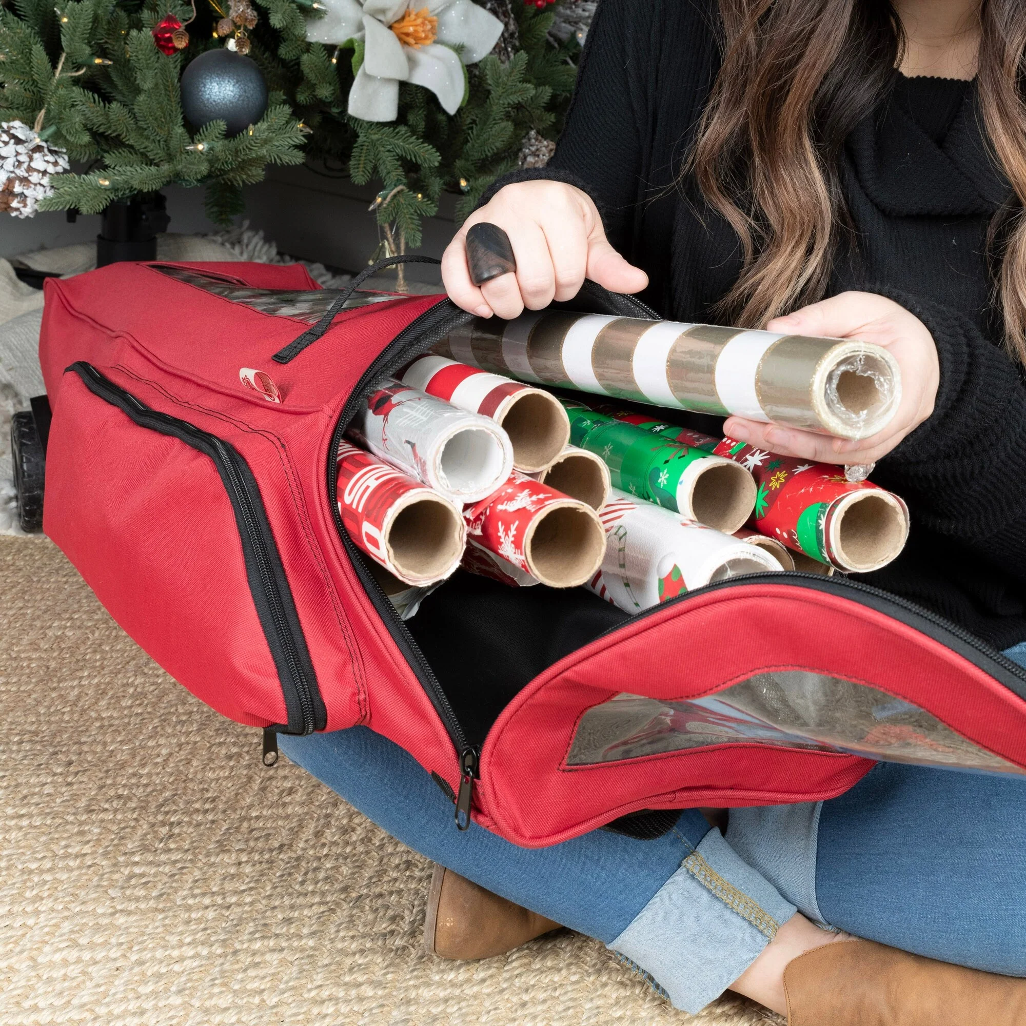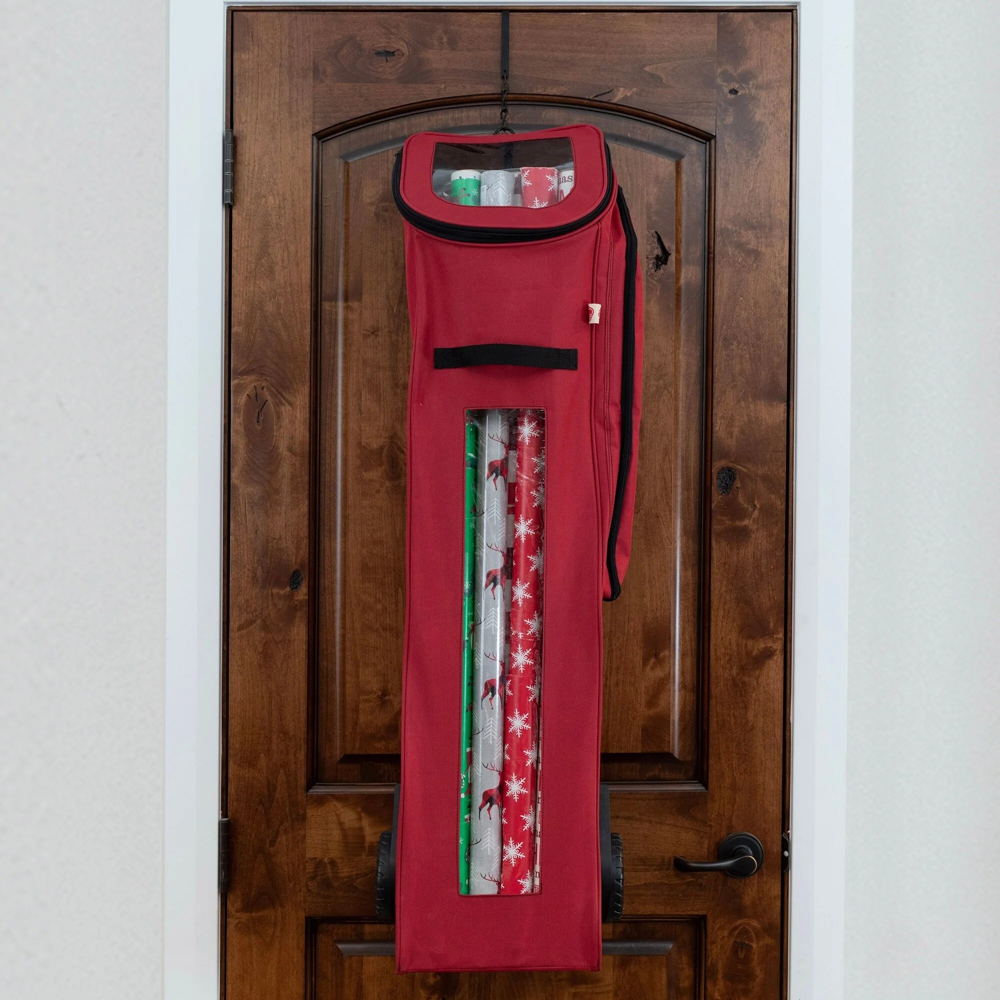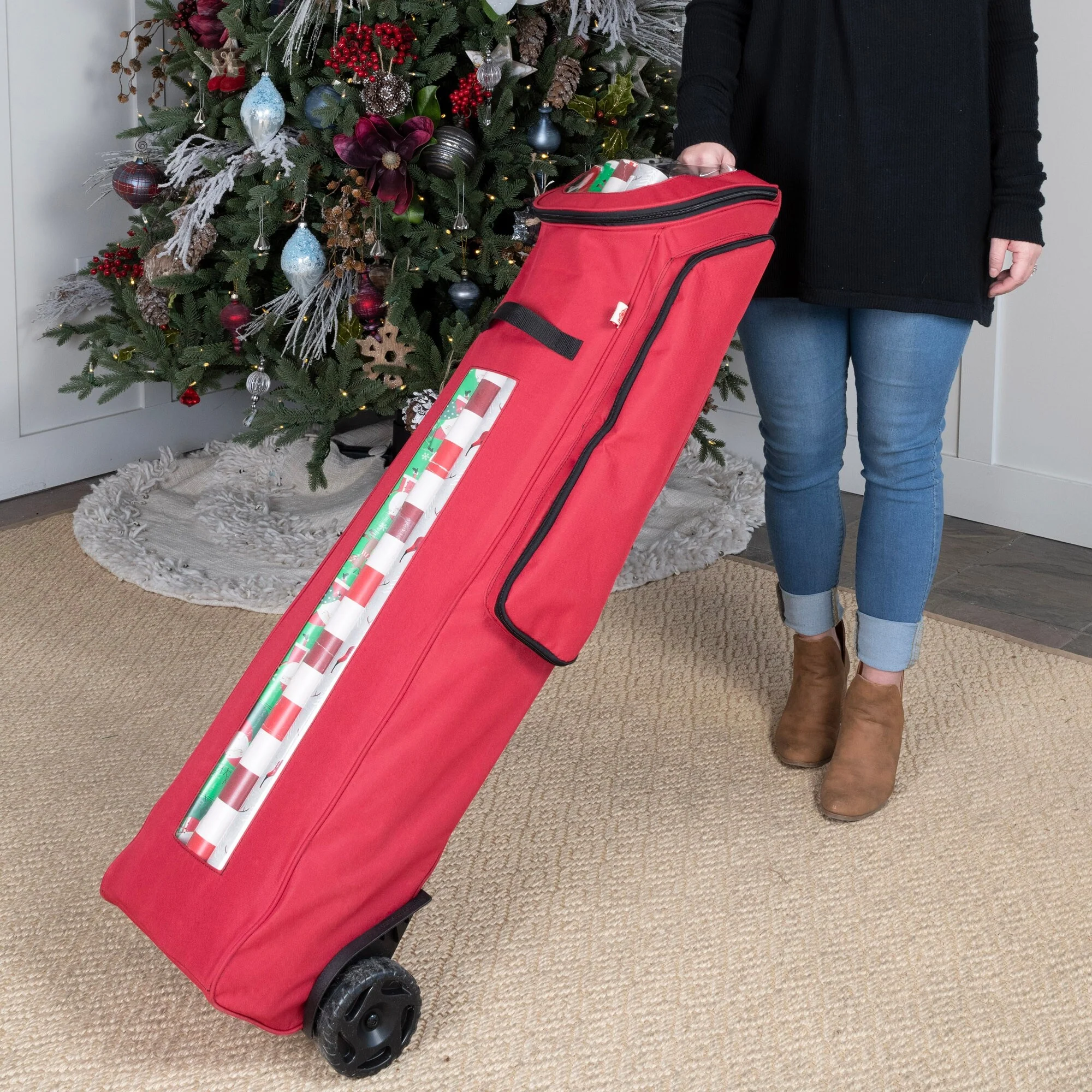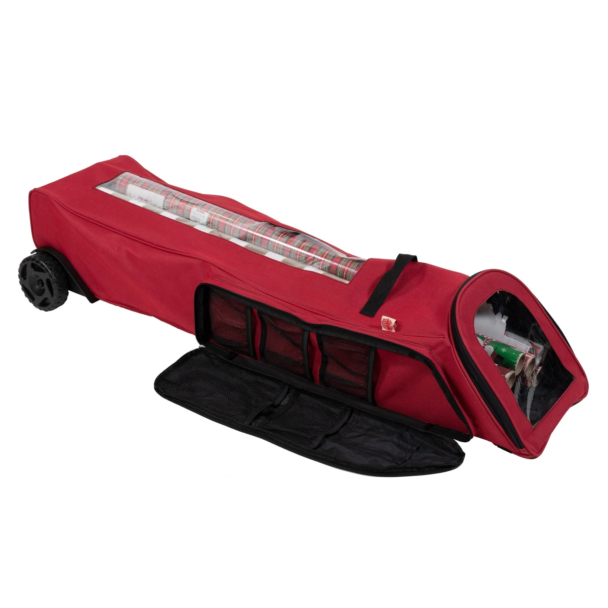 Wrapping paper rolls are a pain to organize and store. You need something that keeps them upright so you can see what's left, but it also needs to be easy to transport from place to place. The best way of storing wrapping paper is in a well-organized gift wrap storage with wheels. That's where EZ Roller wrapping paper storage container comes in! It holds up 12 rolls of wrapping paper (40" tall), has an extra side pocket for tape, scissors, and ribbons, plus clear windows so you can easily spot what kind of gift wrap is left without having to pull each roll out. The bag features oversized wheels to make transporting your gift wrap supplies as simple as possible - just pull or push the bag along with one hand!