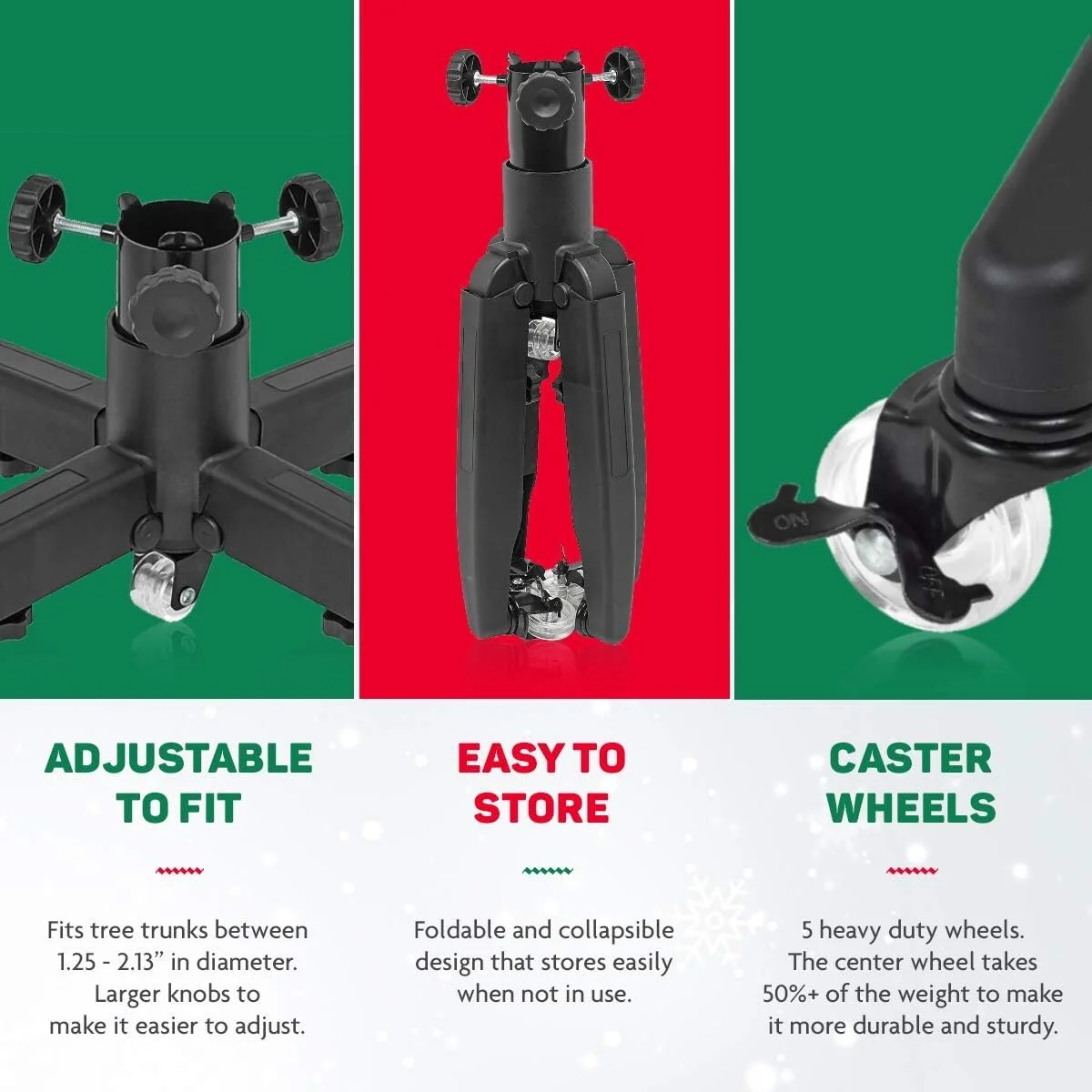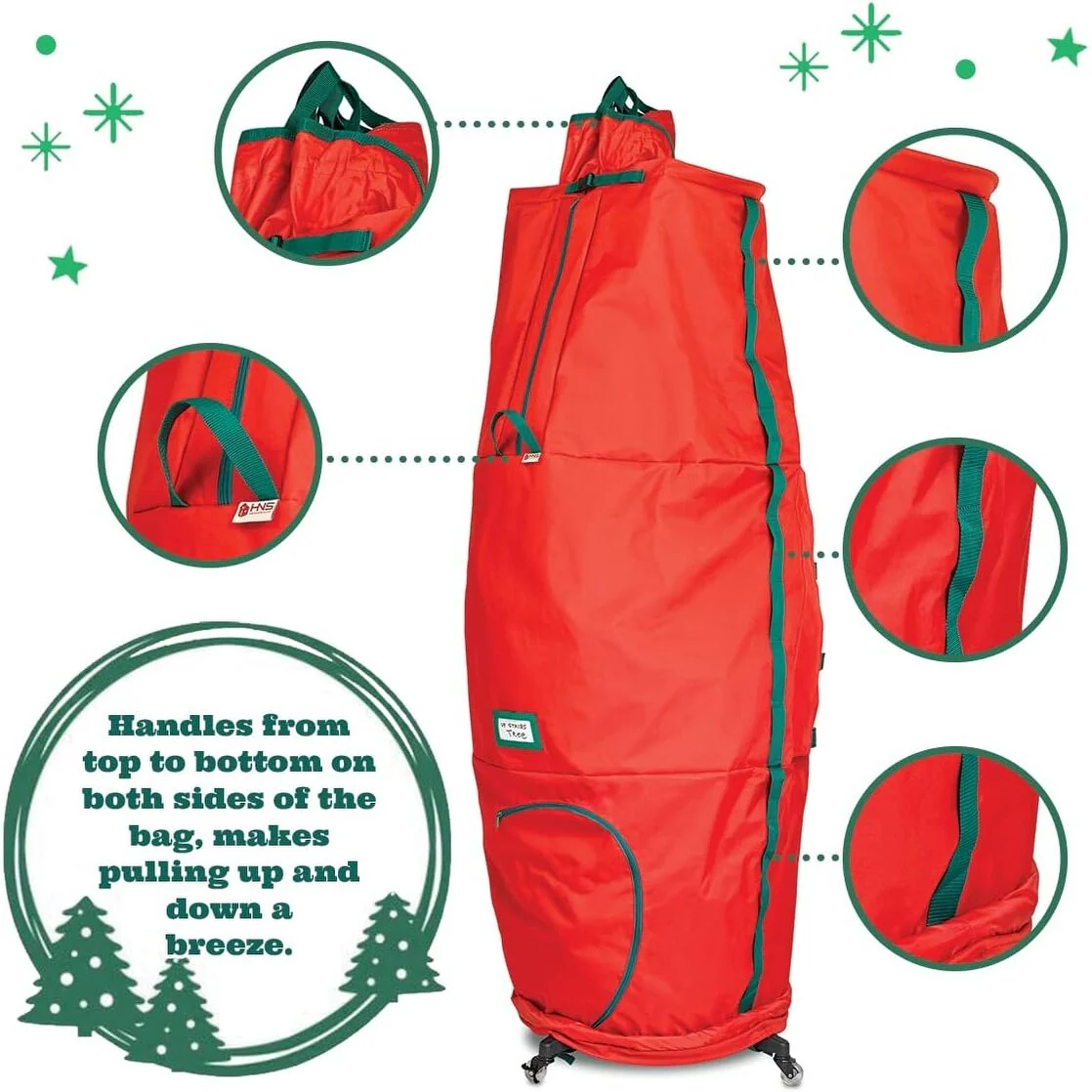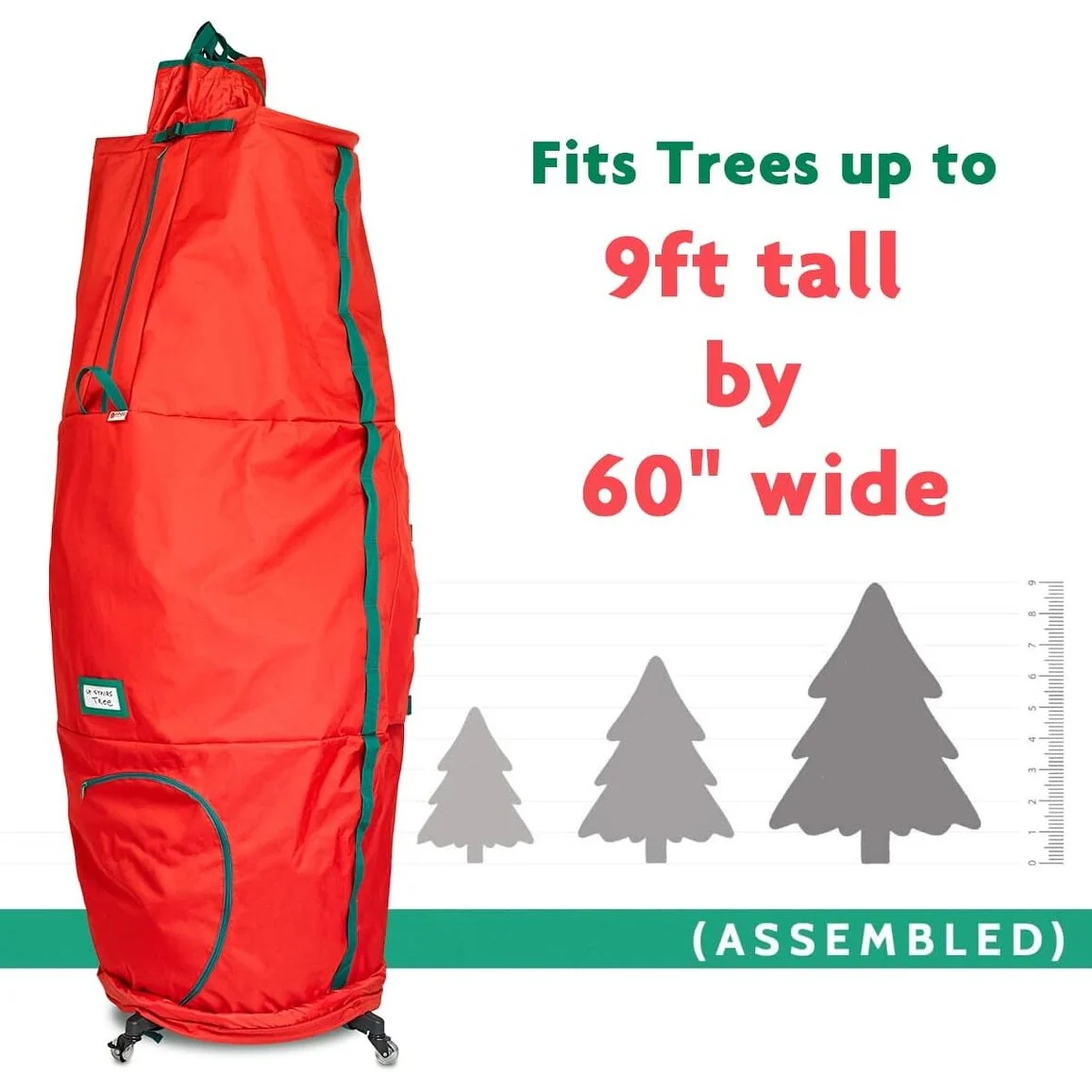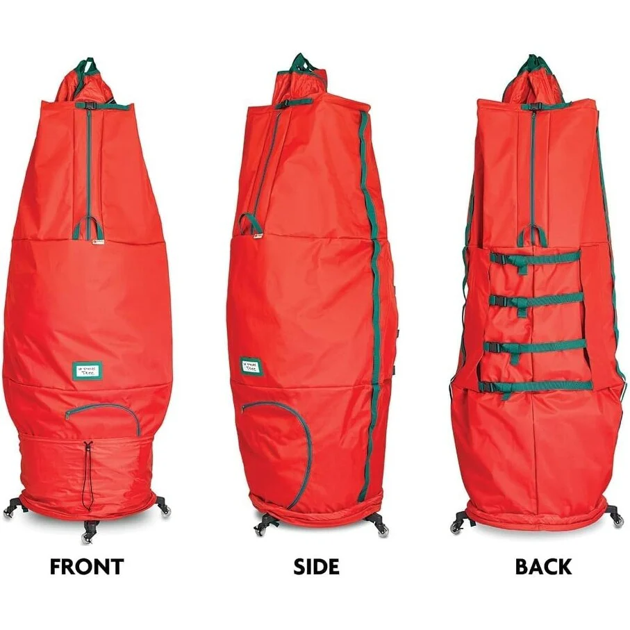 <b>Pro-Grade Upright Christmas Tree Storage Bag with Rolling Stand</b><br> Preserve the tradition, your Christmas tree is an investment that should last for many cherished holiday seasons to come, it should be treated with care if you want the tree to last year after year. With our Christmas Tree Storage Bag, you can be sure your artificial tree will be preserved and protected so you can enjoy years of use. Because of its spacious size, it prevents branches from bending and breaking, so your tree comes out looking the same as when you stored it. <br><br> <b>Premium Scratch Resistant Rolling Casters</b><br> Our tree cover is paired with a heavy-duty stand with casters which makes it doubly convenient to store your Christmas tree. You would be able to move your tree easily from one area to another because you can steer the bag on various surfaces including carpet, wood, laminate, vinyl, and tile. Regardless of the tree pole shape, the stand is universal to fit all tress and assembly is quite easy. The bag stays neatly hidden under the tree skirt. After the holidays, just remove the outer skirt, locate, and pull up the top of the bag and lay flat around the tree. Ensure all buckles, zippers, and drawstrings are open before pulling up. Adjust the bag away from snags or twists, then continue to pull up. There is an extra space for the top section of the tree at the bottom of the bag. <br><br> <b>KEY FEATURES:</b> <br>•Fits Up to 9-Foot-Tall Trees. 60-inch Diameter <br>• Hides under tree skirt, so once Assembled, Just close zippers pull up bag and move into storage <br>• Durable Stand with Scratch-Resistant Nylon Casters <br>• Locking Wheels <br>• Premium Quality Tear-free 600D Fabric, Inside PVC for Added Durability <br>• Sturdy Zippers, Drawstring, and Adjustable Straps <br>• Reinforced Carry Handles <br>• Transparent Label Card Slot <br>• Cheerful & Festive Holiday Colors <br><br>