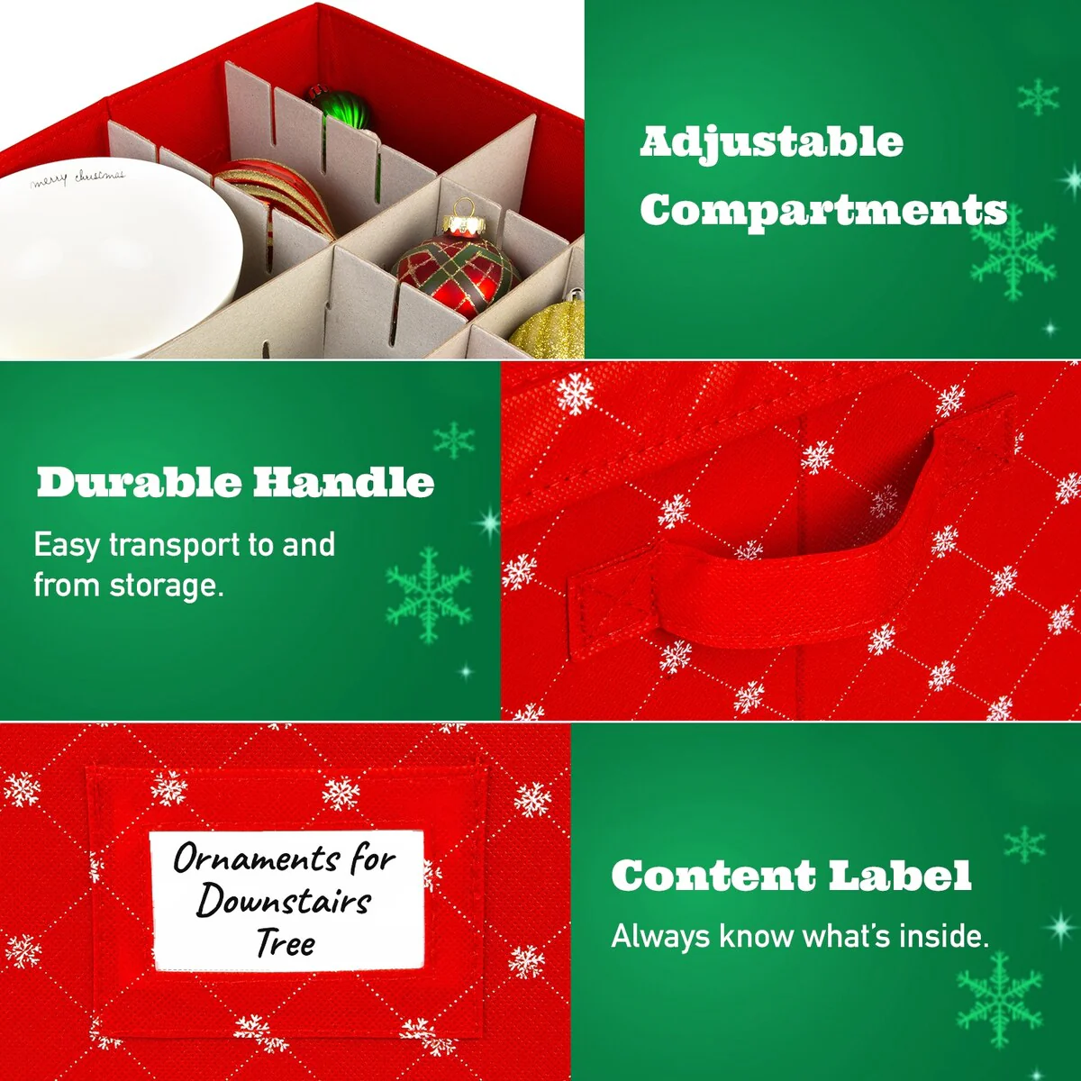 <b>With a unique combination of utility and design,<br>Hold N Storage brings to you their Holiday Ornaments Storage Box that is the perfect way of organizing your holiday trinkets this Christmas. </b></p> Decorating the Christmas tree is a tradition that every family loves, but storing the ornaments in a huge box can make the process less fun and organized while even increasing the chances of injury.<br>But with our new storage box solution, you can now remain worry-free.</p><b>Decked Up in The Season-Appropriate Colors! </b><br>Our ornaments organizer box comes with customizable up to 64 compartment inserts, that can help you store each trinket individually.<br>Built using a tear-resistant material, the storage box is sturdy and long lasting.<br>The material ensures that the ornaments remain protected from dust as well as moisture.</p><b></b><br>This 12 by 12-inch storage box also comes with inbuilt handles that make it surprisingly easy to lug around,<br>a great trait for keeping these things out of mind till the next holiday season appears.
