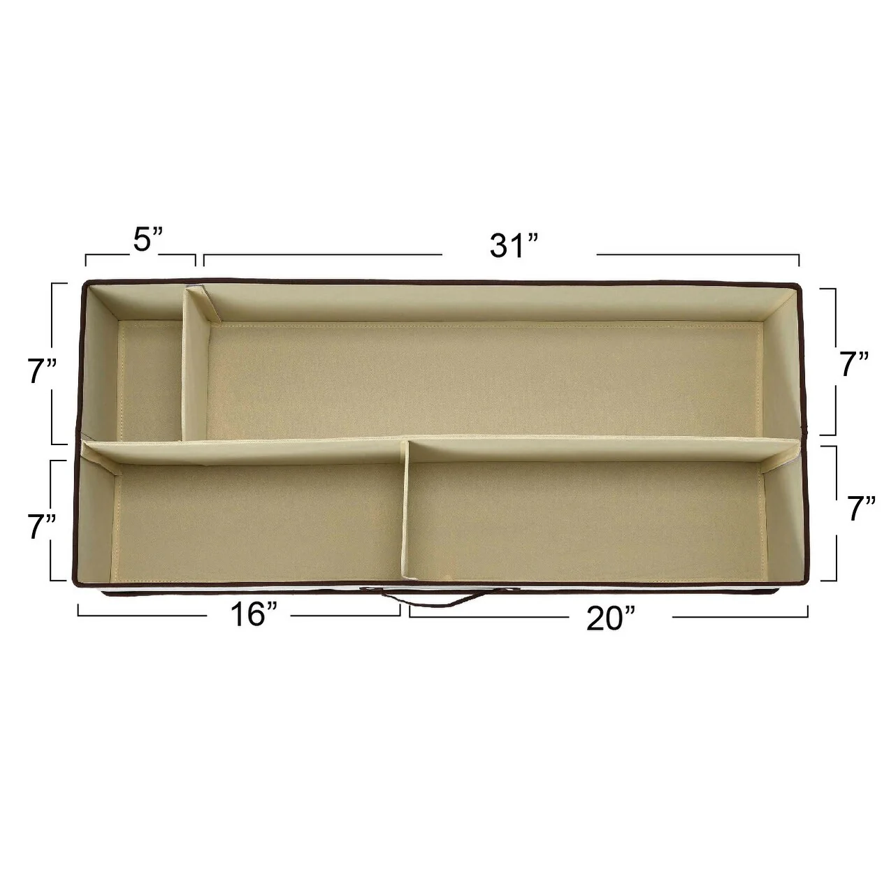 - Natural and brown canvas wrapping paper organizer; Compartments measure 5 inches x 7 inches, 16 inches x 7 inches, 20 inches x 7 inches, and 31 inches x 7 inches