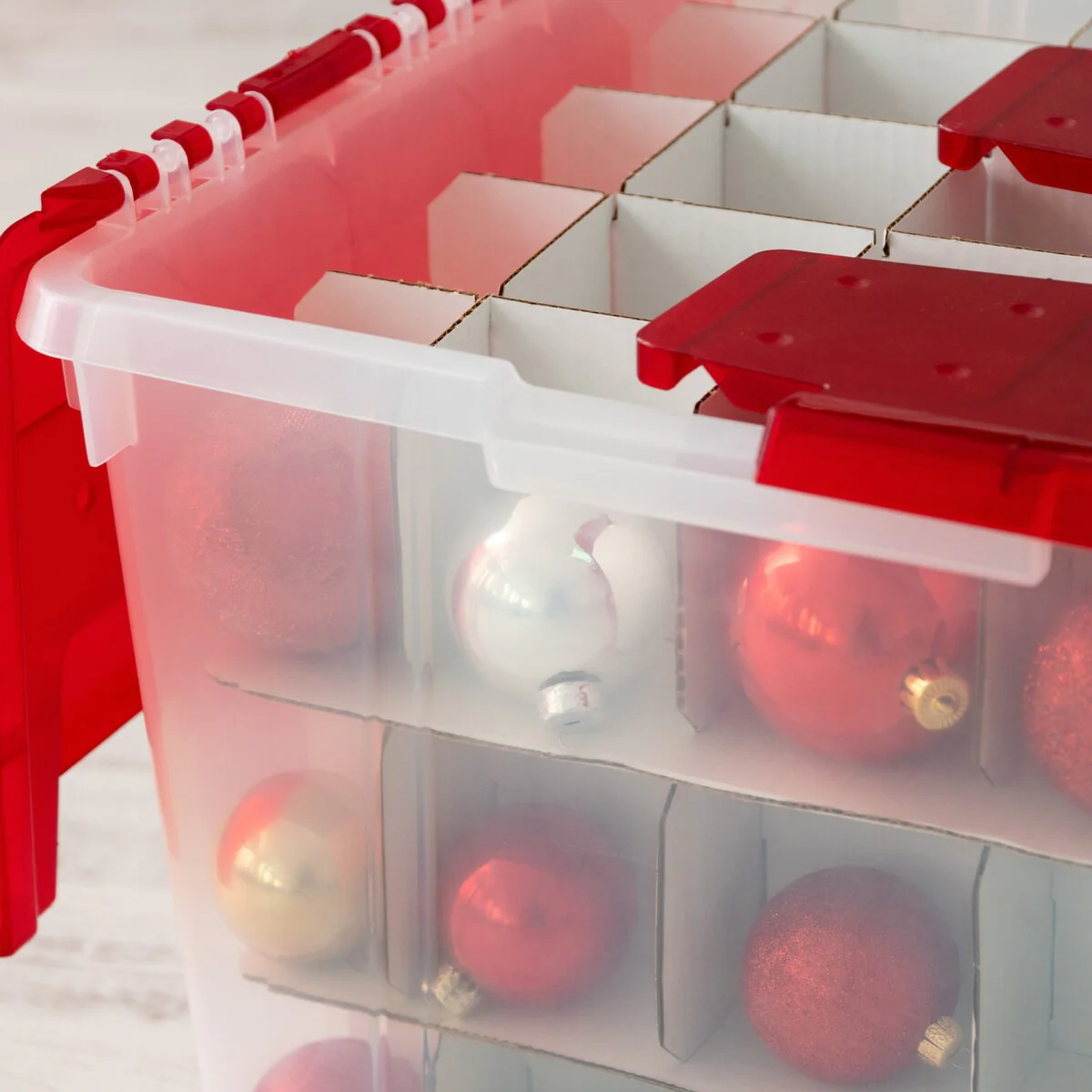 Includes 2 ornament storage bins. Ornament storage has never been easier. The Wing-Lid Ornament Storage Box is a great solution for storing up to 75 standard ornaments. Each storage tote with lid comes with a set of dividers that will help keep your ornaments safe and secure. The hinged lids on the large plastic totes offer easy access to contents. When closed, the storage bin with dividers can stack on top of each other. This is a great solution to use with or without dividers to use for gift wrapping storage, craft room organization, or more to fulfill all of your holiday storage needs. Made in the USA. Set of two.