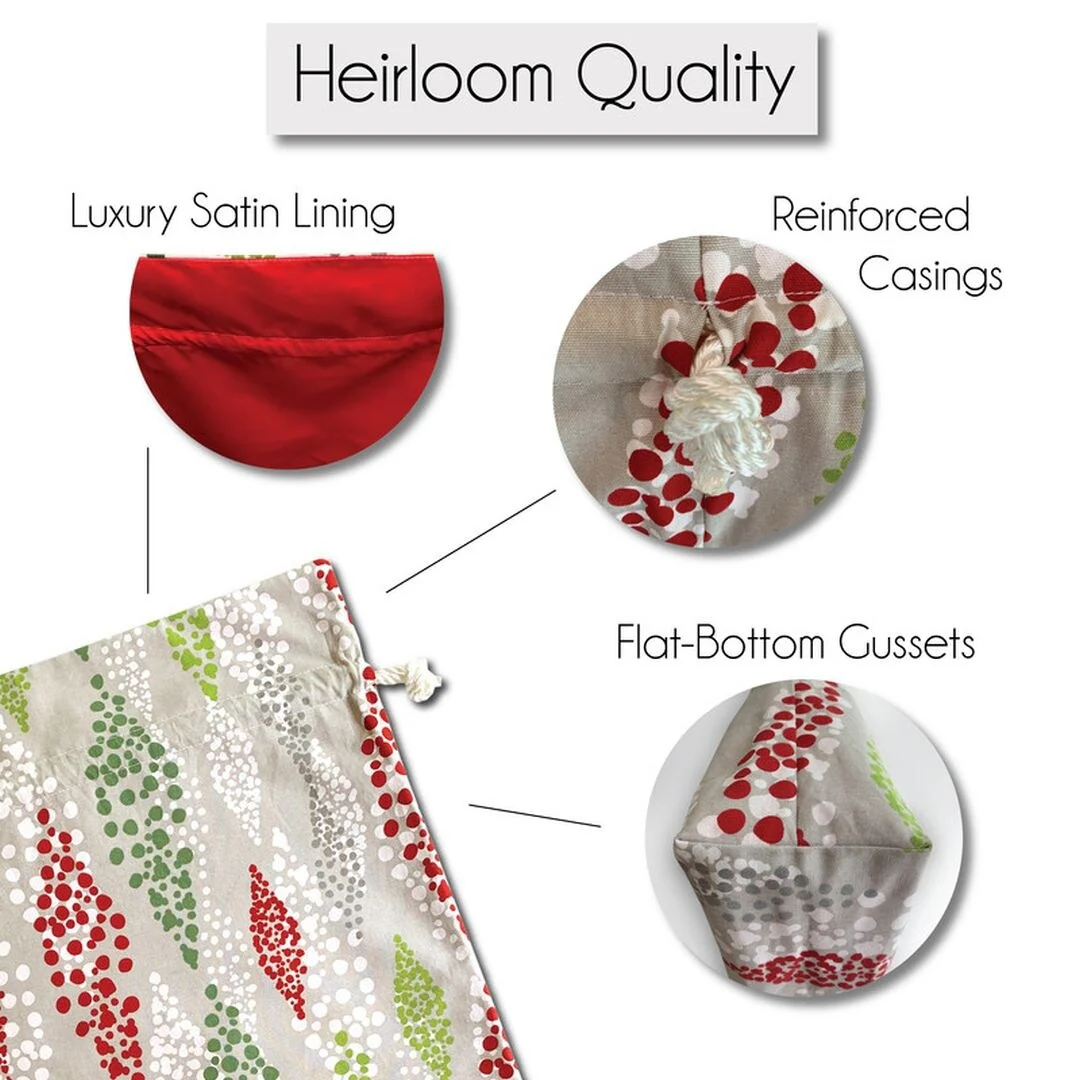 Introducing our exquisite 2 PCs Angelo Santa Sack, a meticulously crafted drawstring cotton gift bag. This hand-sewn masterpiece boasts opulent luxury with its satin lining, promising heirloom-quality charm. The double cord feature ensures effortless opening and closing, adding convenience to your festive preparations. Our commitment to durability shines through the reinforced seams, guaranteeing longevity. Crafted from upholstery-weight 100% cotton, this Santa sack embodies both strength and elegance. We take pride in our workmanship and stand by it with a lifetime warranty. Elevate your holiday gifting experience by ordering now, and allow us to help you create cherished memories this Christmas. Make this festive season truly remarkable with this Santa Sack gift bags, a timeless symbol of your thoughtfulness and care.