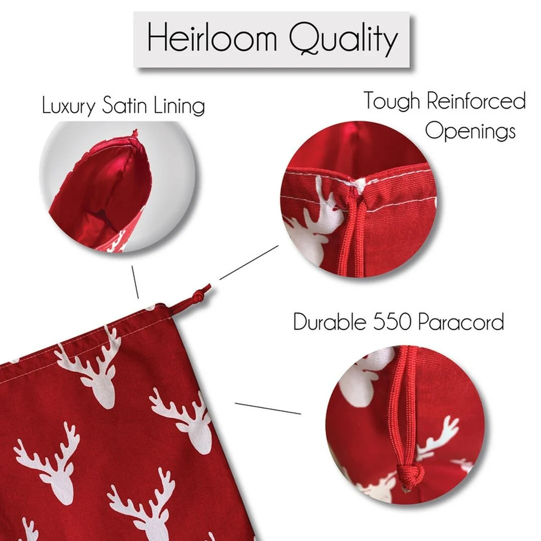 Introducing our exquisite 4 PCs Antlers Santa Sack, a meticulously crafted drawstring cotton gift bag. This hand-sewn masterpiece boasts opulent luxury with its satin lining, promising heirloom-quality charm. The double cord feature ensures effortless opening and closing, adding convenience to your festive preparations. Our commitment to durability shines through the reinforced seams, guaranteeing longevity. Crafted from upholstery-weight 100% cotton, this Santa sack embodies both strength and elegance. We take pride in our workmanship and stand by it with a lifetime warranty. Elevate your holiday gifting experience by ordering now, and allow us to help you create cherished memories this Christmas. Make this festive season truly remarkable with this Santa Sack gift bags, a timeless symbol of your thoughtfulness and care.