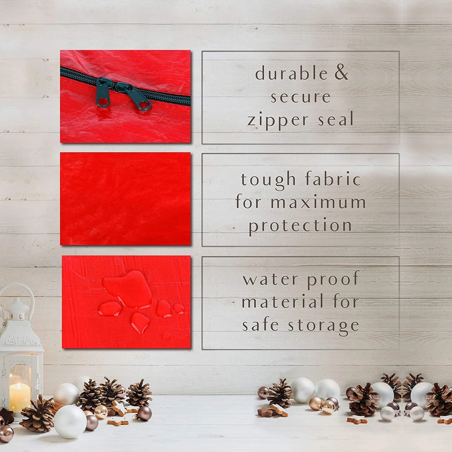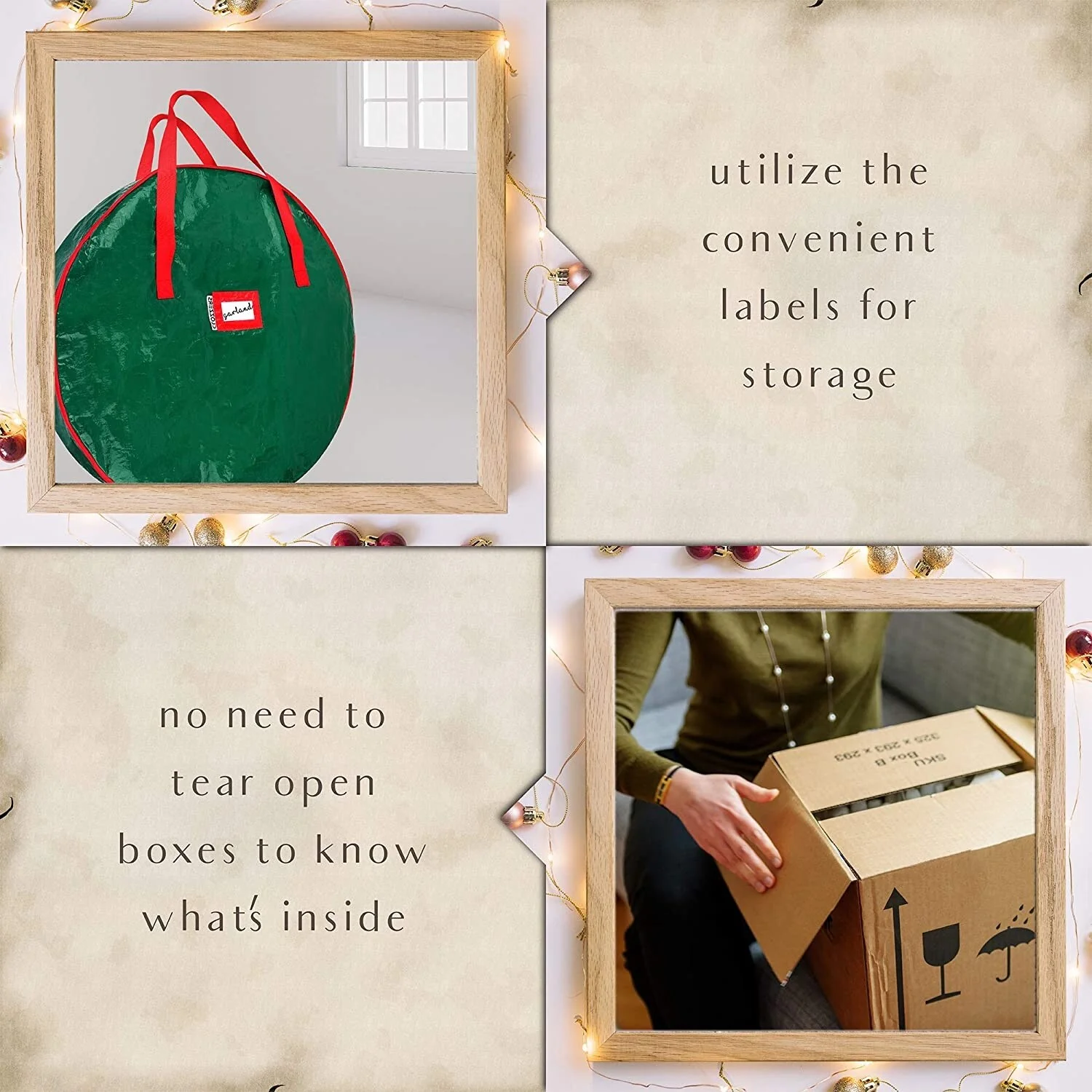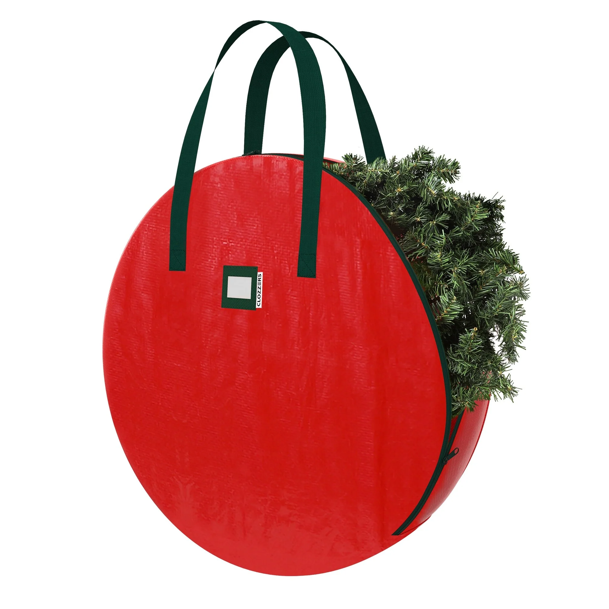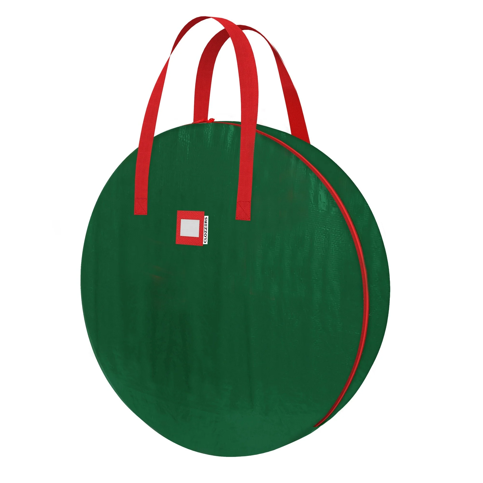 We've made the tough task of taking down the Christmas wreath and garland so much easier!All you do is place the wreath or garland roll in this heavy-duty storage bag, zip it up and store it!Next holiday season, unzip and start hanging the well-kept greenery back up for another greatChristmas!Our tear proof bag measures 30" x 30" x 8", so it fits wreaths and rolls of garland up to 30" indiameter. The strong handles and dust-proof, water resistant material will keep your Christmasgreenery protected all year.Features:Large Wreath & Garland Storage Bag: After the holidays, simply place any wreath or rolls ofgarland, up to 30" in diameter, into this strong bag then zip it up and store in a closet or the atticuntil the next holiday.Tough Material with Water Resistance: This is the Christmas wreath storage solution that you'lluse for many years! It's tear-proof and water resistant to ensure the long life of your holidaygreenery.Reinforced Handles for a Good Grip: Easily carry your wreath or garland to the attic or to thestorage shed with the sturdy reinforced handles!Quick Identification Card Slot: When you have multiple bags, it sure is nice to be able to labelthem so you may find what you need when youre looking for them!Wreath Remains Dust Free & Undamaged: Trust Clozzers Christmas Wreath & Garland Bag tokeep your holiday greenery free of dust and moisture. Next year, simply unzip and withinseconds, you'll be decorating with wreaths and garland again.