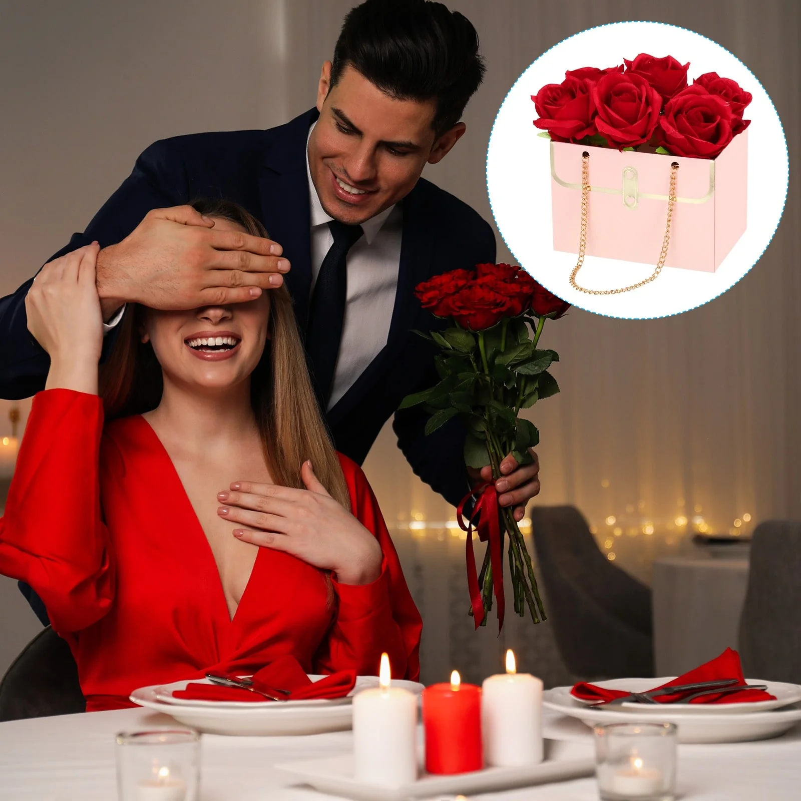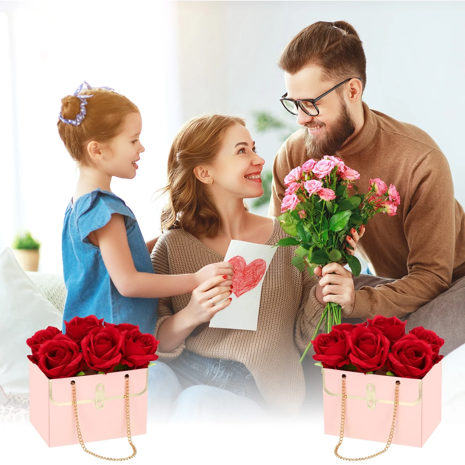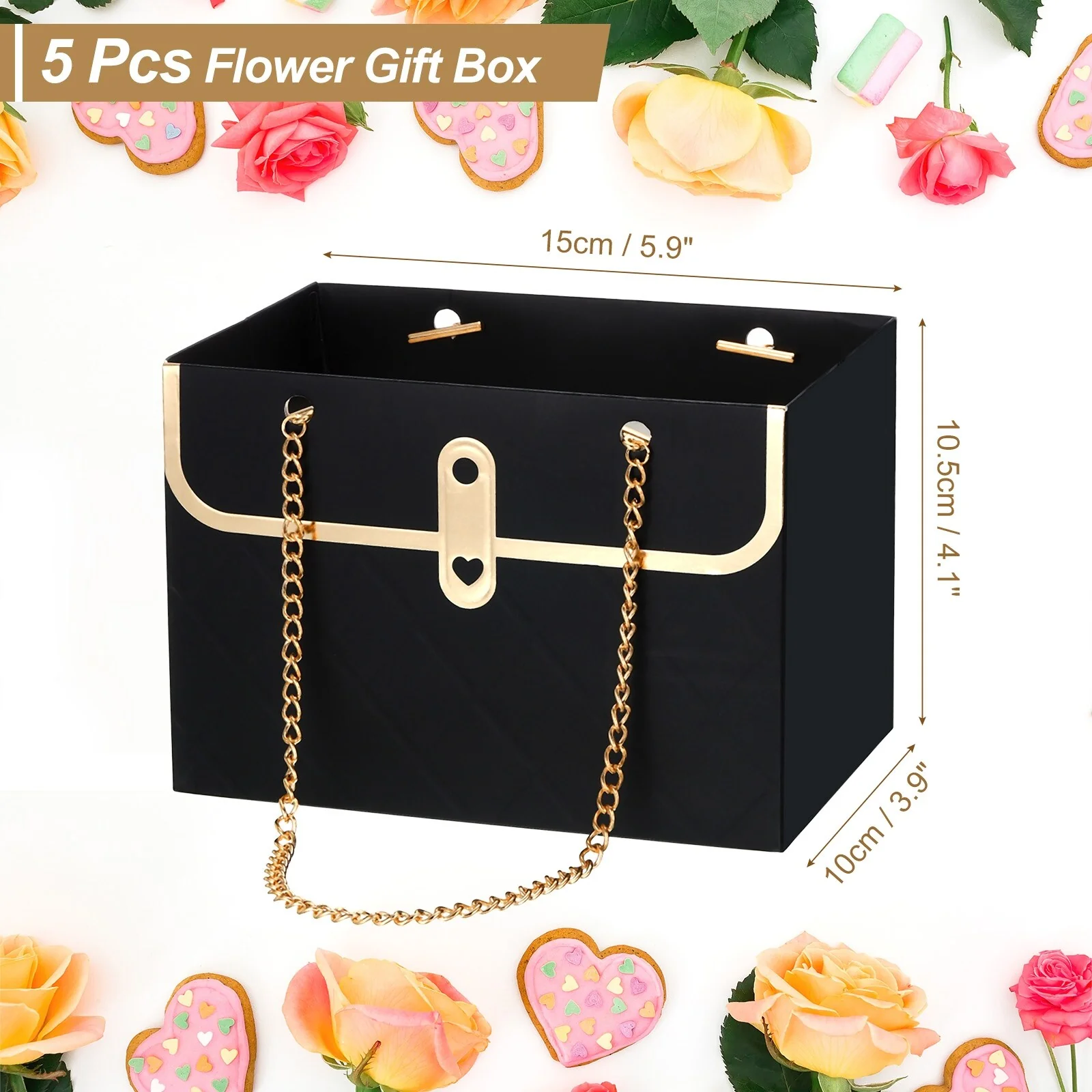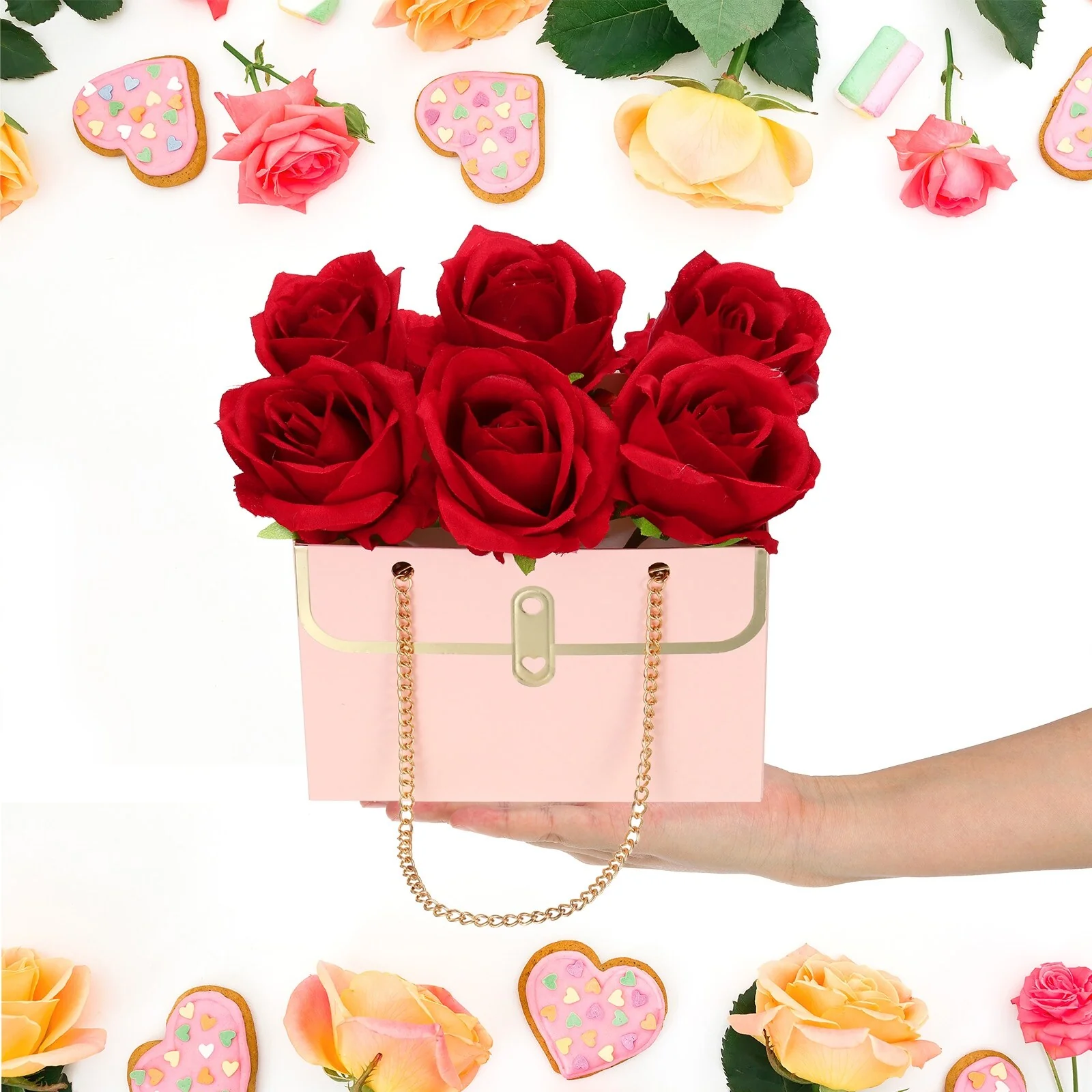 These flower boxes are designed in the shape of a handbag, which is lightweight and looks elegant; The double chain handle is design lets you carry it easier; The three-dimensional shape can make flowers stretch easily and flexibly, showing the beauty of flowers.