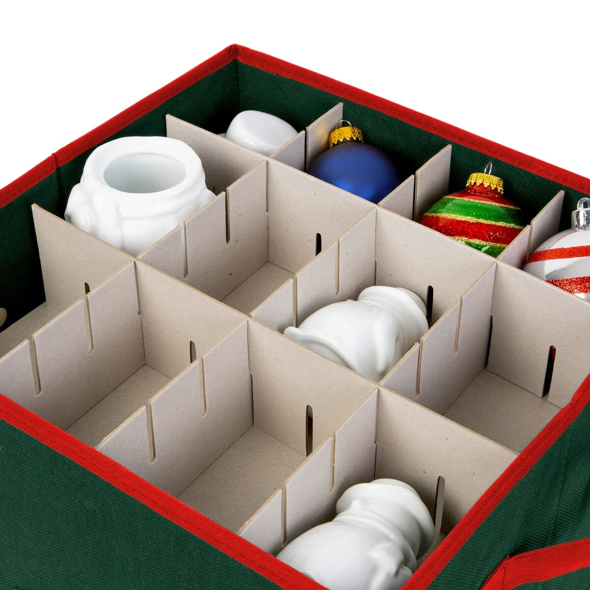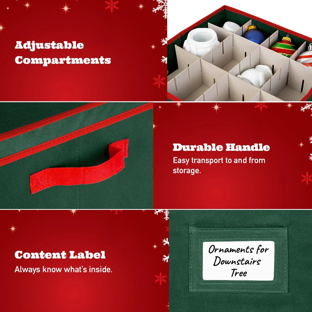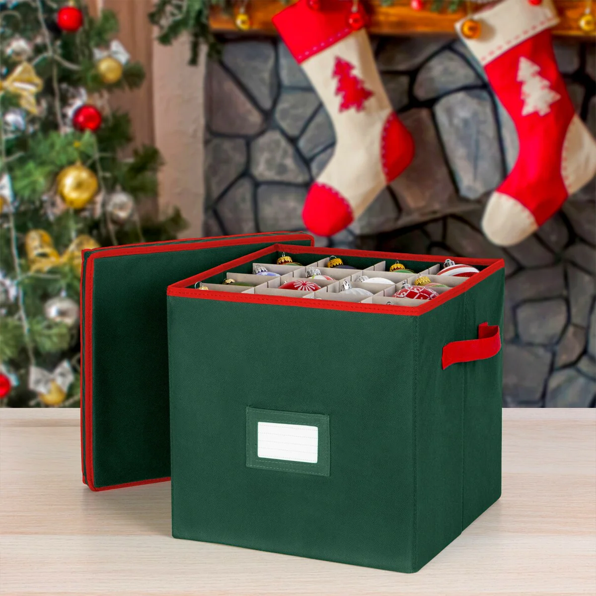 <b>With a unique combination of utility and design,<br>Richards Homewares brings to you their Holiday Ornaments Storage Box that is the perfect way of organizing your holiday trinkets this Christmas. </b></p> Decorating the Christmas tree is a tradition that every family loves, but storing the ornaments in a huge box can make the process less fun and organized while even increasing the chances of injury.<br>But with our new storage box solution, you can now remain worry-free.</p><b>Decked Up in The Season-Appropriate Colors Of Green/Red! </b><br>Our ornaments organizer box comes with a whopping 64 compartment insert, that can help you store each trinket individually.<br>Built using a tear-resistant Non-woven material, the storage box is sturdy and long lasting.<br>The material ensures that the ornaments remain protected from dust as well as moisture. </b><br>This 12” by 12-inch by 12-inch storage box also comes with inbuilt handles that make it surprisingly easy to lug around,<br>a great trait for keeping these things out of mind till the next holiday season appears.</p><b>General Features:</b><br>✅ Non-Woven Polypropylene Fabric Covered Body <br>✅ Fashion color fabric <br>✅ 64 separate compartments for individual ornament storage<br>✅Convenient handles</p><b>Buy with Trust and Quality Assurance! <br>All our products are built based on the principles of integrity, value, and innovation, with a commitment towards bringing the best for our customers.