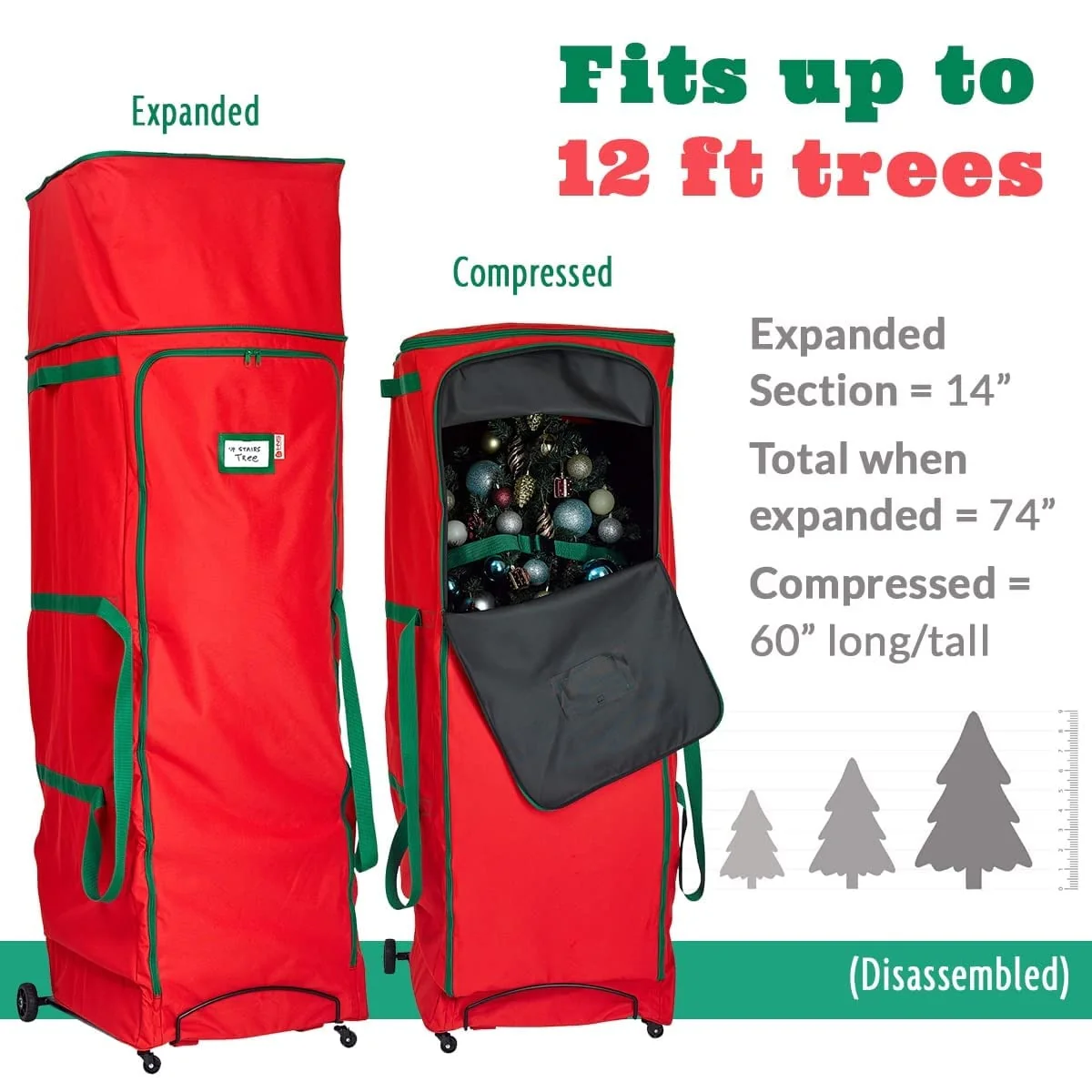 Once you have disassembled your tree, place the pieces in the bag. The top is expandable if you need more space. Using the interior compression straps will allow you to cinch up your tree preventing them from moving around or sagging. The weight of the tree is supported by the metal frame at the bottom where the wheels are attached. The 2 ball-bearing wheels with metal casters and 2 oversized wheels make mobility easier to and from storage. Store the bag horizontally or vertically in your closet, attic, basement, or garage with peace of mind knowing it will be in the same condition when you open it next year. The dimensions for this tree bag is: Unexpanded = 60” long/tall Expanded section = 14”. Total when expanded =