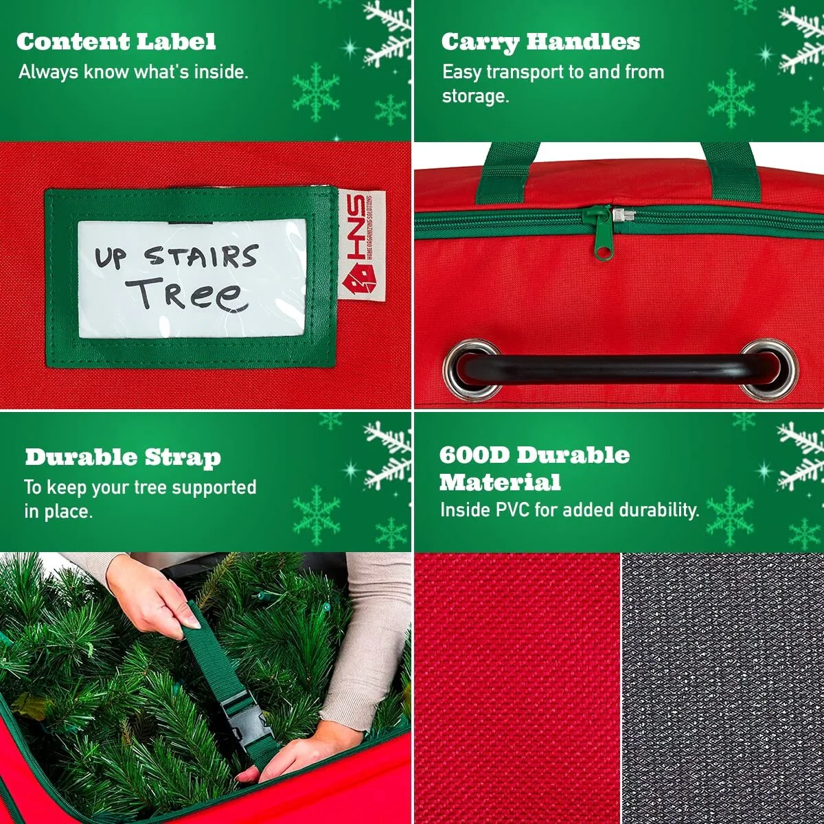 This Pro-Grade Christmas tree bag is made from premium quality 600D Fabric. The fabric is a combination of strong canvas and polyester that is durable yet easy to clean. The reinforced nylon carrying handles ensure they won't rip while moving your tree. Zippers are sewn and bound tightly to prevent dirt, dust, and debris from getting in thus maintaining the condition of the tree. Inner straps securely hold the tree in place. Prevents Damage and Extends Your Trees Life.