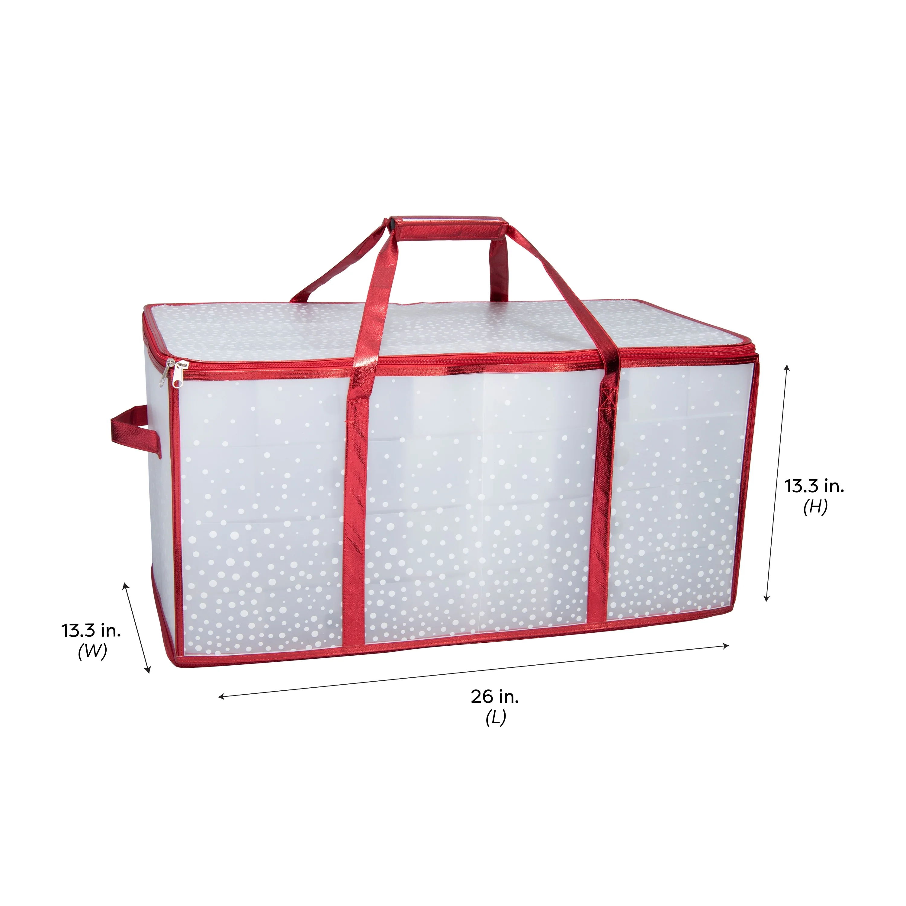 This Simplify 128-Count Ornament Organizer is a perfect holiday accessory to keep around the home! Helps keep up to 128 ornaments in 3" spaces safely stowed away until the next holiday season! Comes with handles for easy carrying and a zipper-lid closure for protection. Supportive cardboard dividers help protect and organize ornaments, and see through material allows you to easily view your ornaments that are stored. Collapses flat when not in use for easy storage during the holiday season.