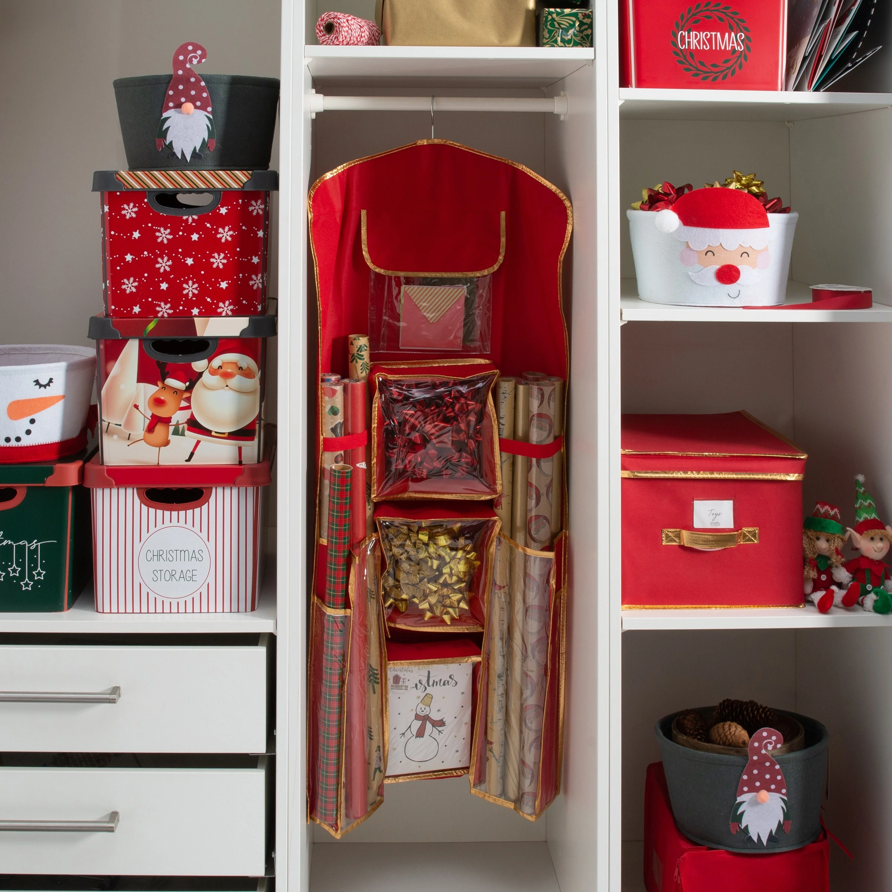 Keep all your holiday gift wrapping essentials in one organized place with the Simplify hanging holiday gift wrap organizer. Hang from the pole in your closet to save space and make all your gift wrapping easily accessible. Fits large and small gift wrapping rolls, clear removable pockets to hold your ribbon and bows and additional compartments for your gift wrapping tools. Take the stress out of wrapping and hang your gift wrapping in one easy work station!