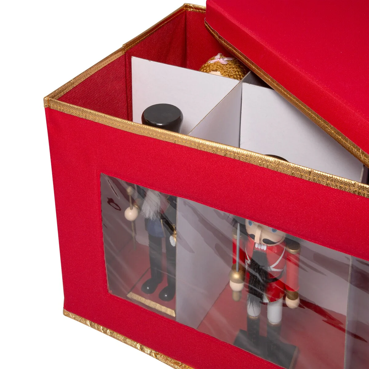 Safely store away your favorite Holiday figurine statues in the Simplify storage box. Designed with 8 individual compartments to hold figurines up to 10" in height, dividers are removable to make for bigger spaces. A fully removable lid allows you to pack and unpack your holiday statues safely and easily, the clear see-through window allows you to identify the decor inside the box. Folds flat when not in use, this makes taking your special holiday decor out or packed away easy for all future holidays!