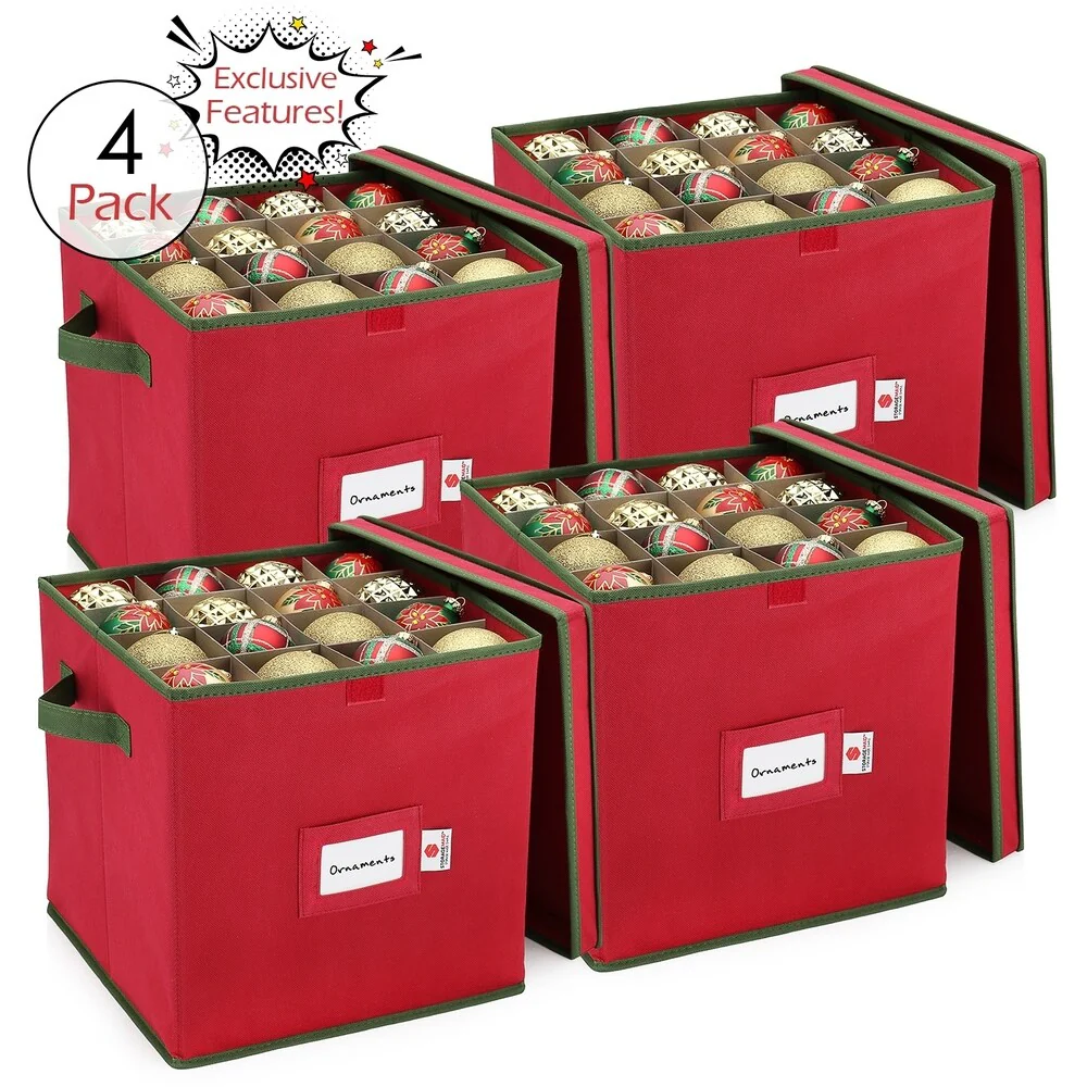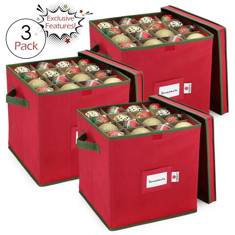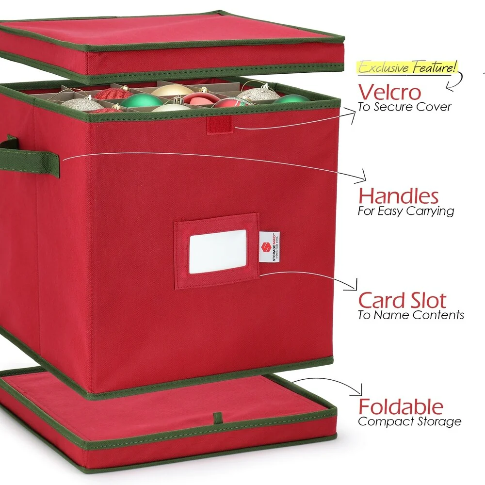 Don't stuff your holiday ornaments in rickety brown cardboard boxes, your fragile ornaments and Christmas decorations will get smashed and mixed up. This storage container made with premium PP Non-woven fabric will keep them safe and organized. Box measures 12 x 12 x 12 inches, Slots measure 3x3 inches, and holds up to 64 ornaments!
