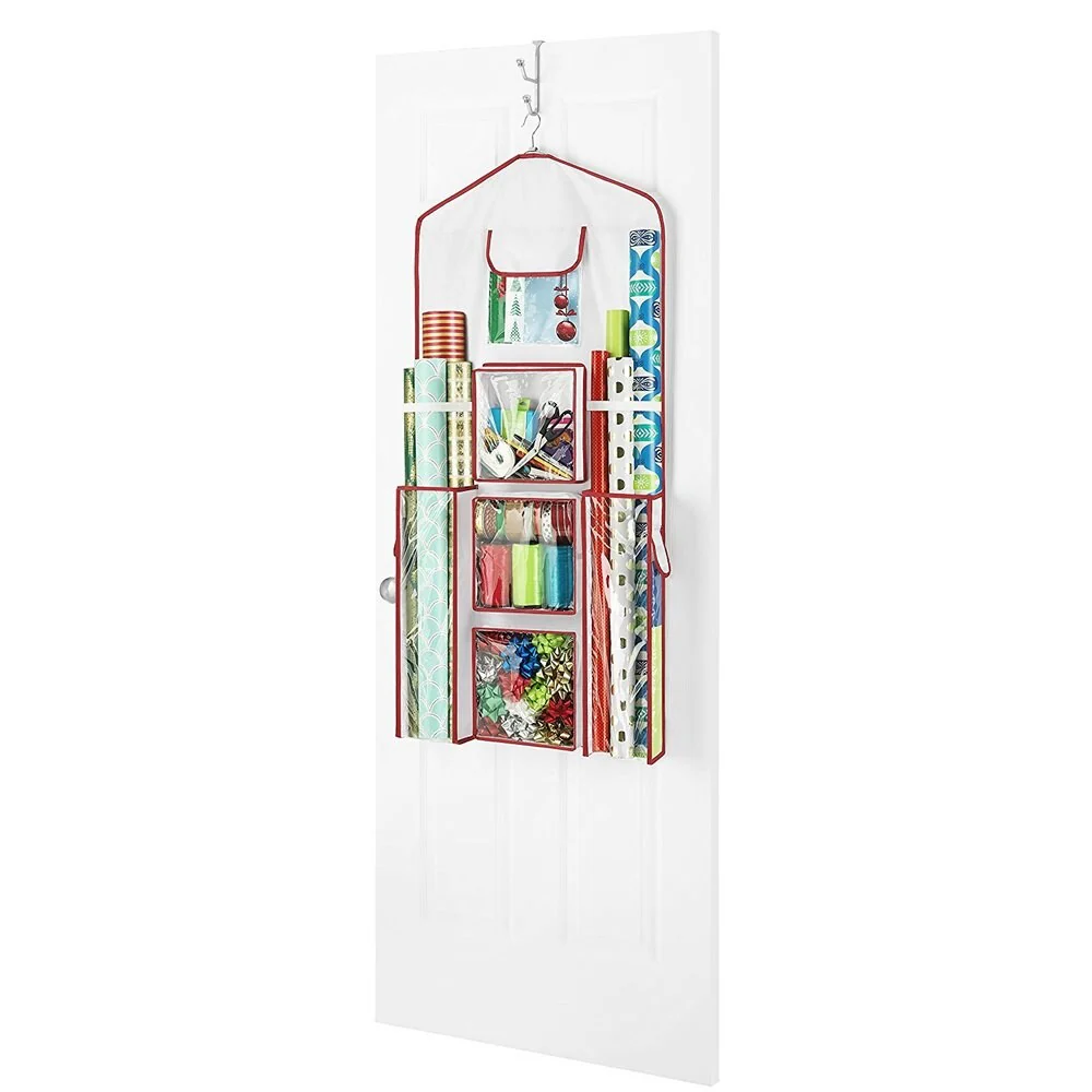 DURABLE HANGING CLOSET ORGANIZER- This durable wrapping paper storage with afabric body and clear pockets will help you organize your home. This hanging storage organizer is tear resistant and has a space to put a hanger that can hang from a closet rod or door hook. The transparent design allows you to store and sort any items easily and see whats in stock. LARGE CAPACITY STORAGE FOR GIFT WRAP AND OTHER SUPPLIES This wrapping paper roll organizer can hold at least ten rolls of gift wrap. It can even hold the longest rolls of 40 wrapping paper. The other pockets are perfect for storing scissors, ribbons and cello tape. The transparent design makes everything clear and easy to find. PERFECT HANGING STORAGE POCKETS FOR YOUR MUD ROOM You can also use this hanger storage pocket in your mudroom or front hall. You can store umbrellas in the side pockets and gloves, hats, scarves sunglasses and even keys in the other pockets. Whitmor design their products to be practical, compact and versatile for different homes. USEFUL FOR STORING TOYS AND OTHER ITEMS Add one of these to your playroom or closet in your kids room, its absolutely perfect for storing shovels, spades, baseball bats and other summer or kid-related items that are usually left lying around. The pockets are great for storing tennis balls, ping pong balls and many other games and toys. The fabric storage pocket will be out of sight and out of mind giving you a neat and tidy home! 100% SATISFACTION GUARANTEED - Service & Guarantee: Whitmor stands by our products 100%. If you have problems, contact us for help. We want you to be fully satisfied with this gift wrap organizer and hope you have fun organizing the wrapping paper rolls from your holiday gift giving this season.