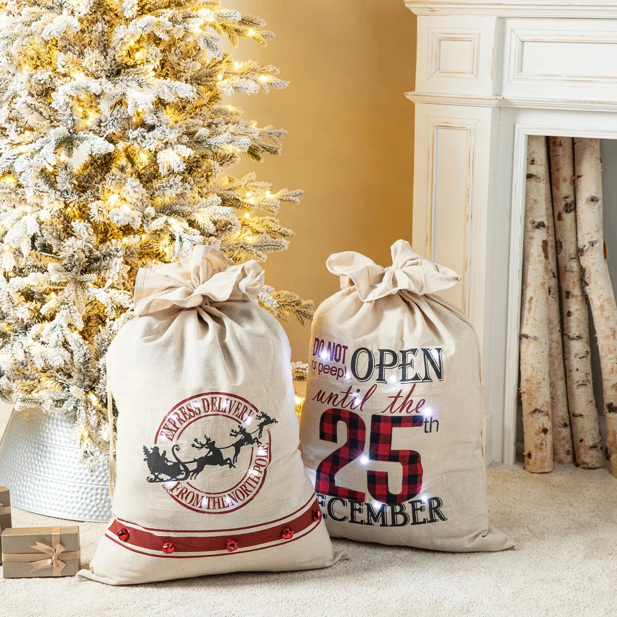 Glitzhome Set of 2 36"H Lighted Burlap Gift Sack with Wordings - white