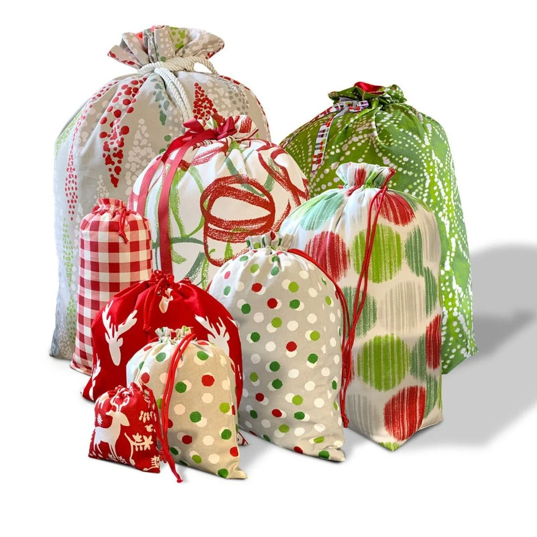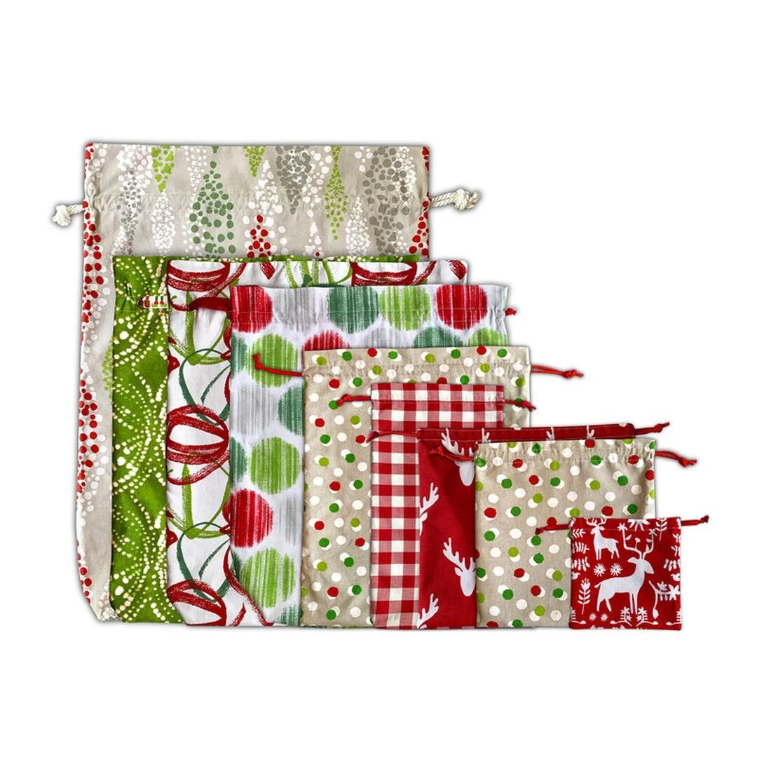 Joita Santa Sack Different Sizes Drawstring 9 Pcs Cotton Fabric Christmas Gift Bag with Luxury Satin Lining for Present