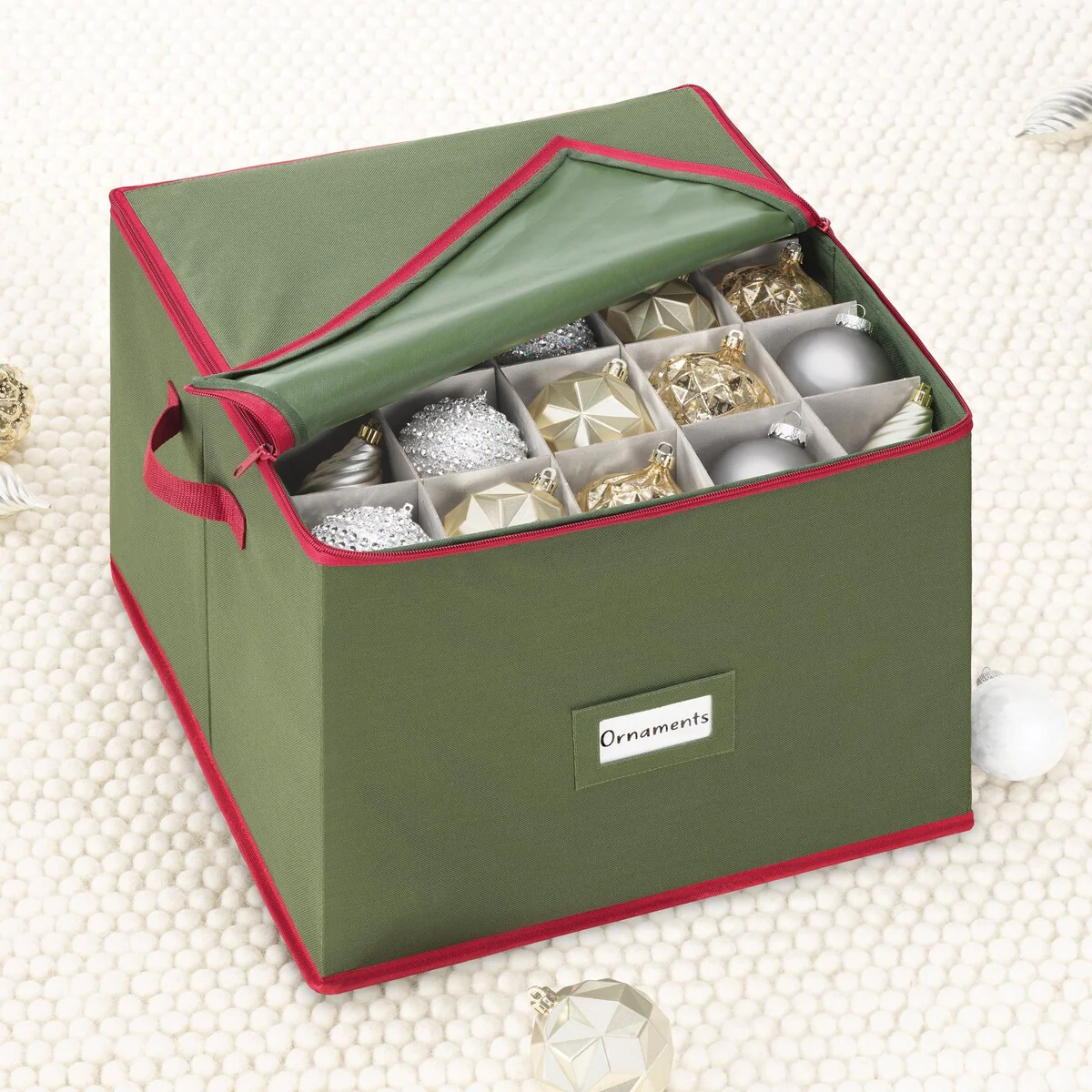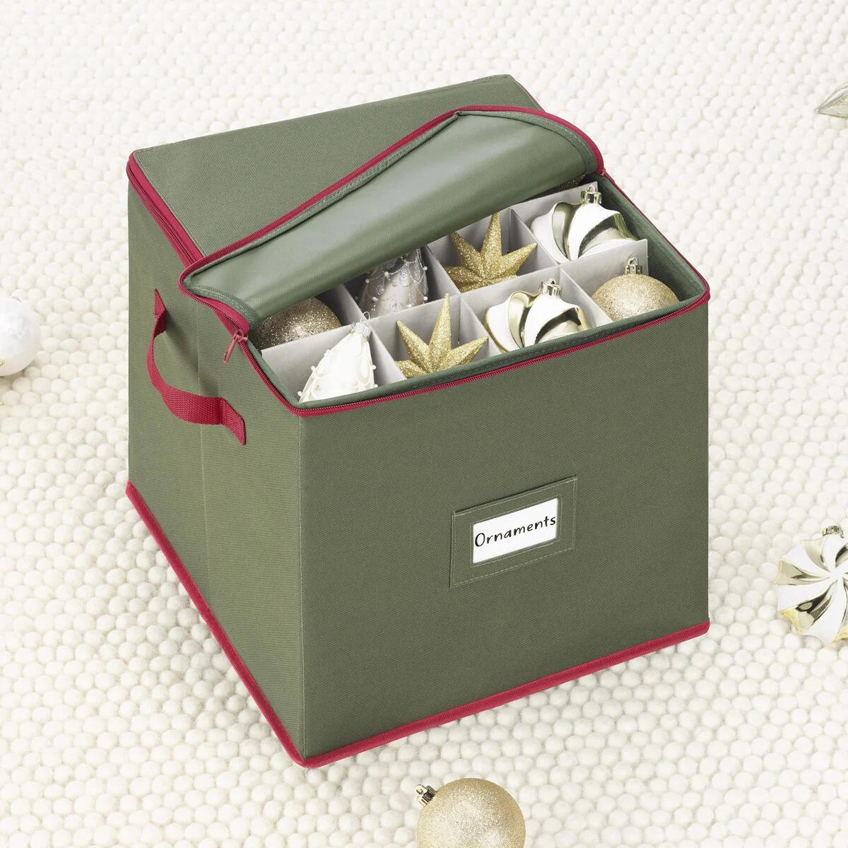 Whitmor 64 Section Christmas Ornament Box with Identification Label, Green with Red Trim