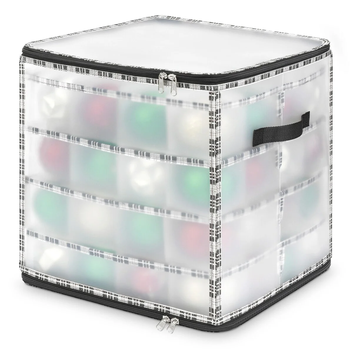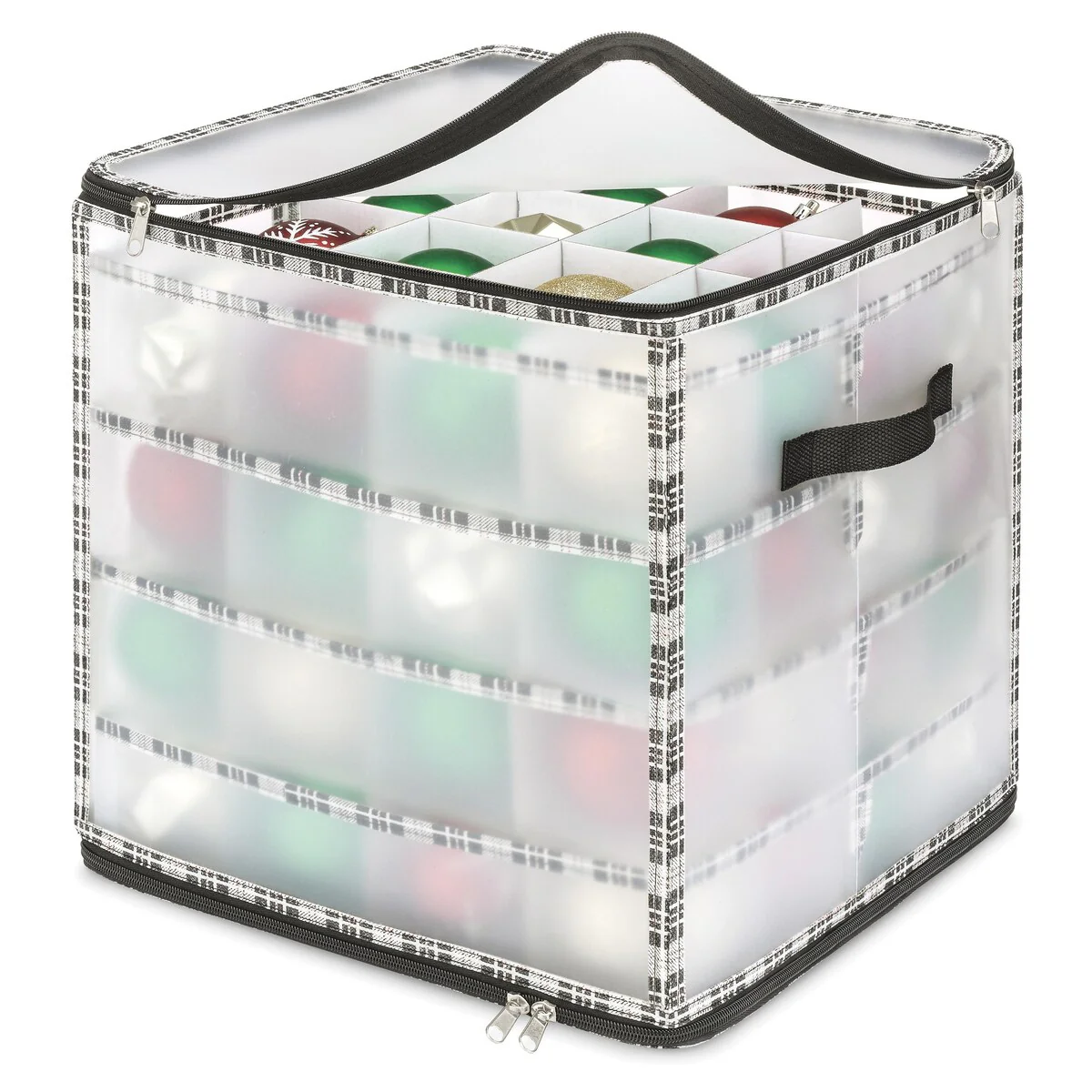 Whitmor Christmas Ornament Cube with 64 Compartments with Removable Trays - Frosty w/Plaid Trim