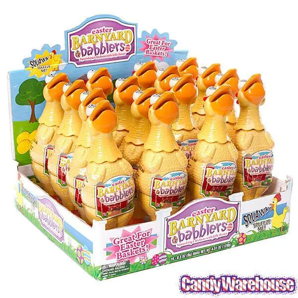 Display box contains 16 Barnyard Babblers - Squawking Chickens with Jelly Beans.