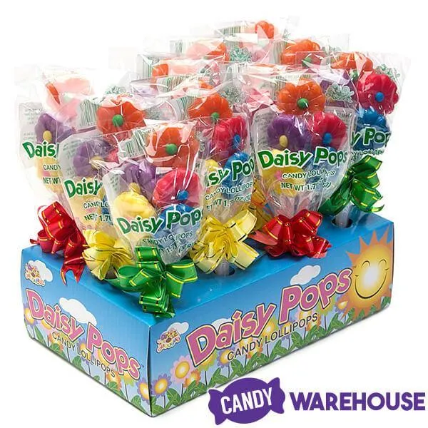 Daisies are the quintessential flower, exuding beauty and charm in a simple yet elegant form. Here we offer candy daisy flowers all wrapped up in a cute bouquet of five flowers of assorted colors. The perfect party favor for spring and Mother's Day events, Daisy Pops feature an assortment of fruity flavors sure to delight your taste buds.