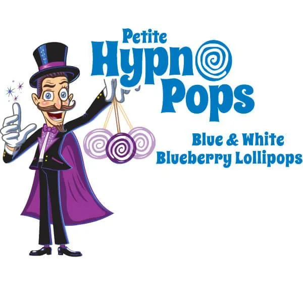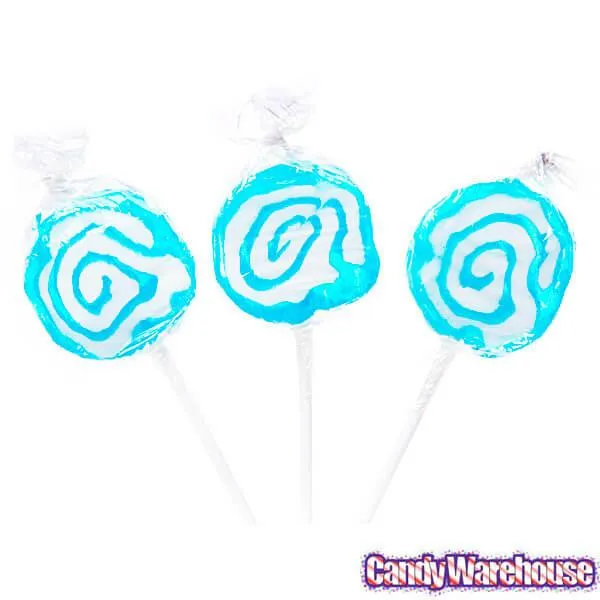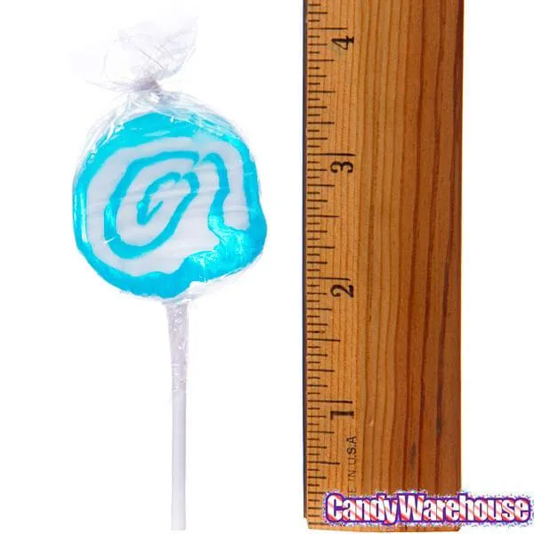 Bag contains 100 individually wrapped Petite Hypno Pops Blue & White Swirled Lollipops.